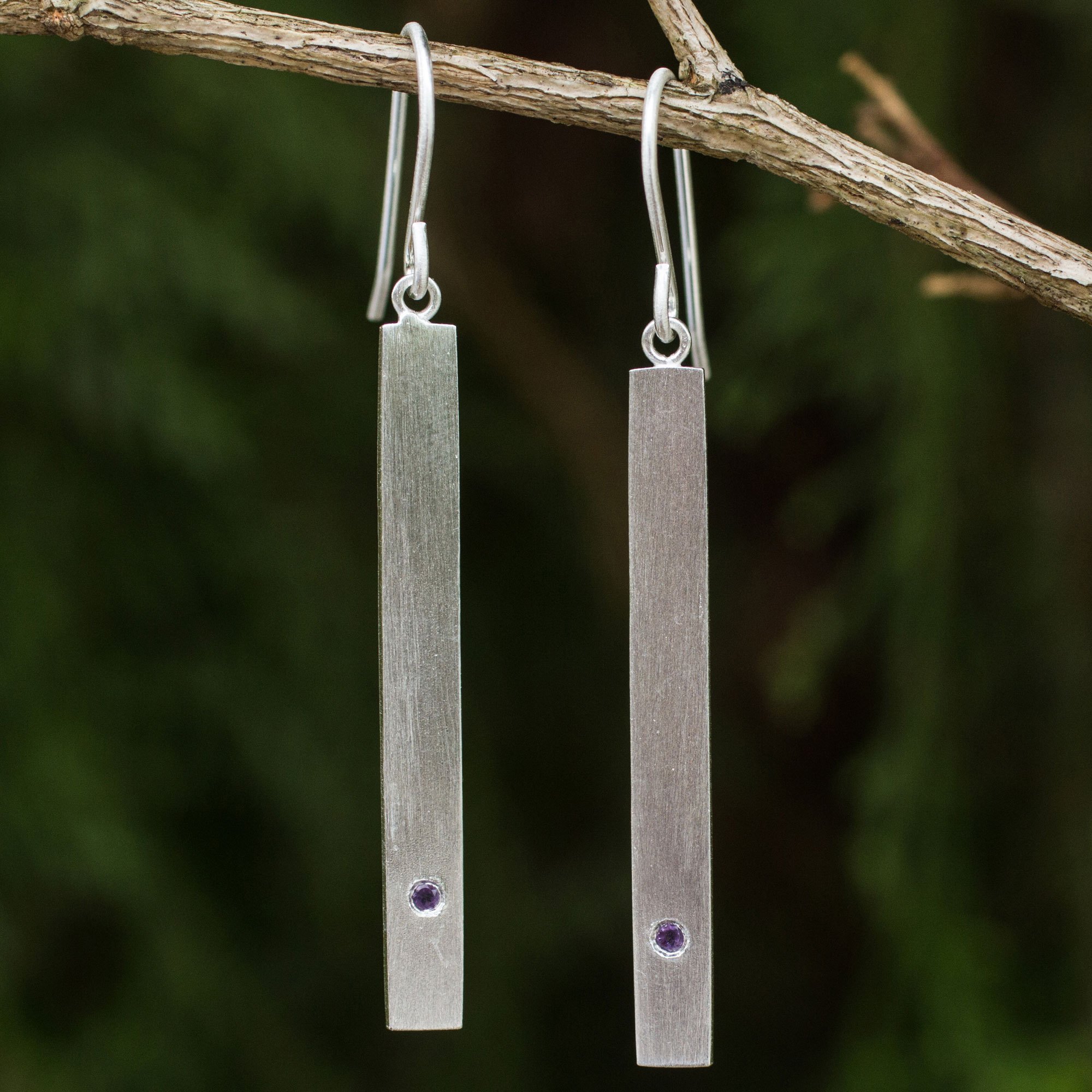 Artisan Crafted Brushed Silver and Amethyst Dangle Earrings, 'Simple Wisdom'