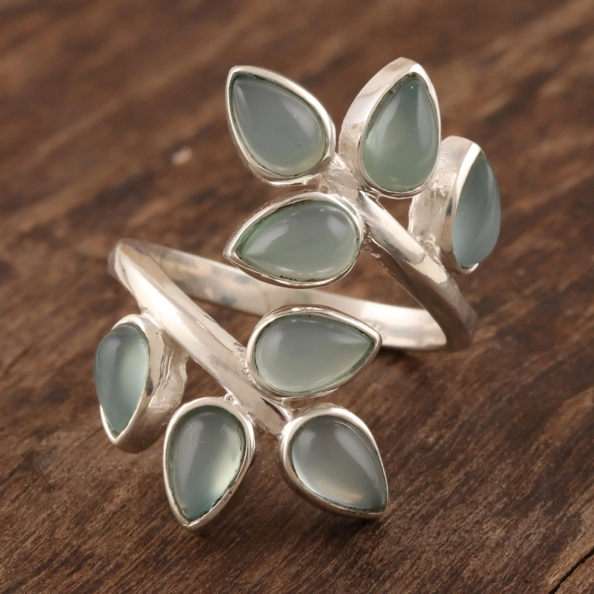 This pretty cocktail ring from designer Neetu Barathi in India showcases the subtle appeal of chalcedony. Artisans set the aqua stones in sterling silver bezels, like leaves on a branch.