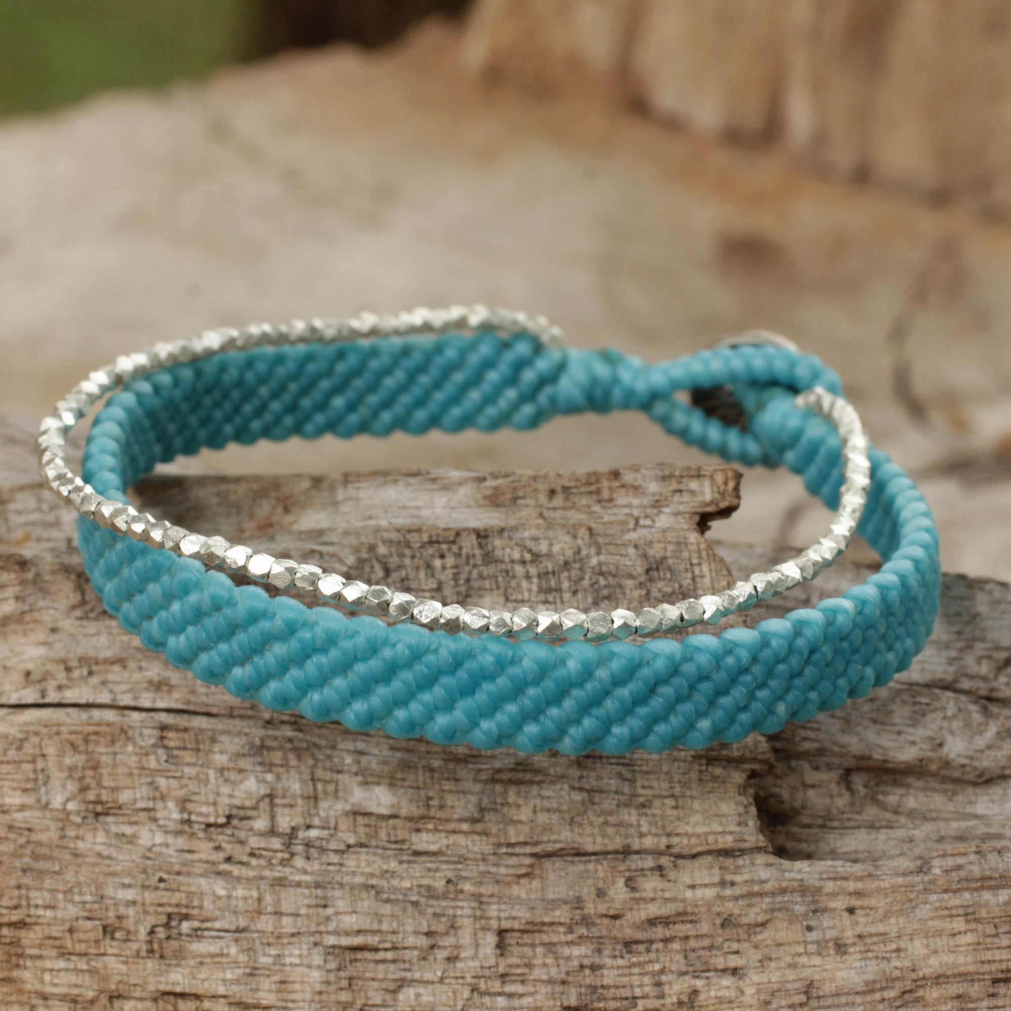 Thailand's Napapat, with her usual flair for hill tribe style, presents this fun wristband bracelet. A band of knotted sky-blue cords is complemented by a slender strand of glimmering silver beads. The beads are crafted by Karen hill tribe artisans, and feature facet-like edges for added sparkle. A distinctive silver button secures the bracelet.