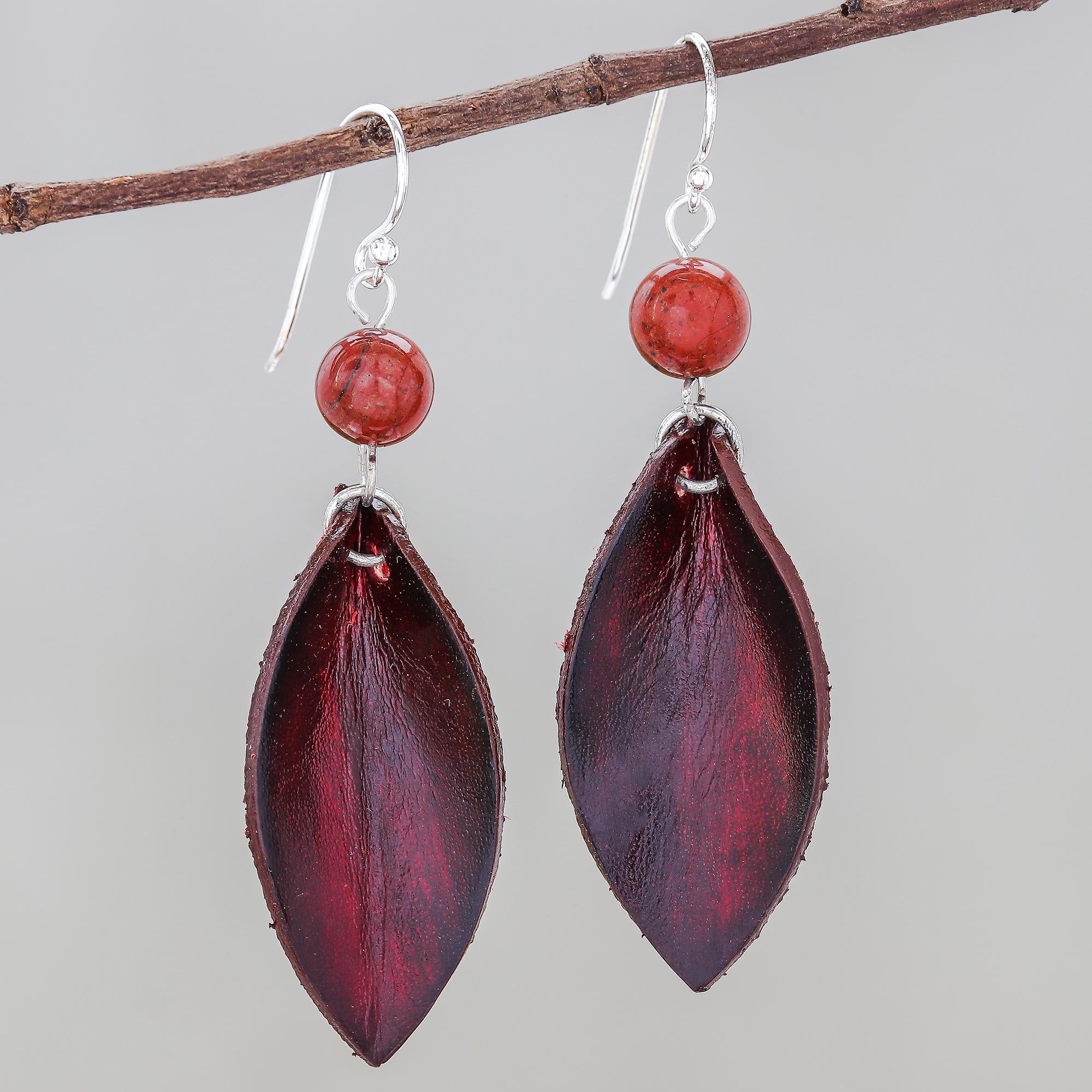 Working with leather, Thai artisan Chaloemphon creates fabulous jewelry with contemporary flair. These earrings feature supple leather petals in deep red, topped by polished beads of jasper. The earrings swing from polished sterling silver hooks.