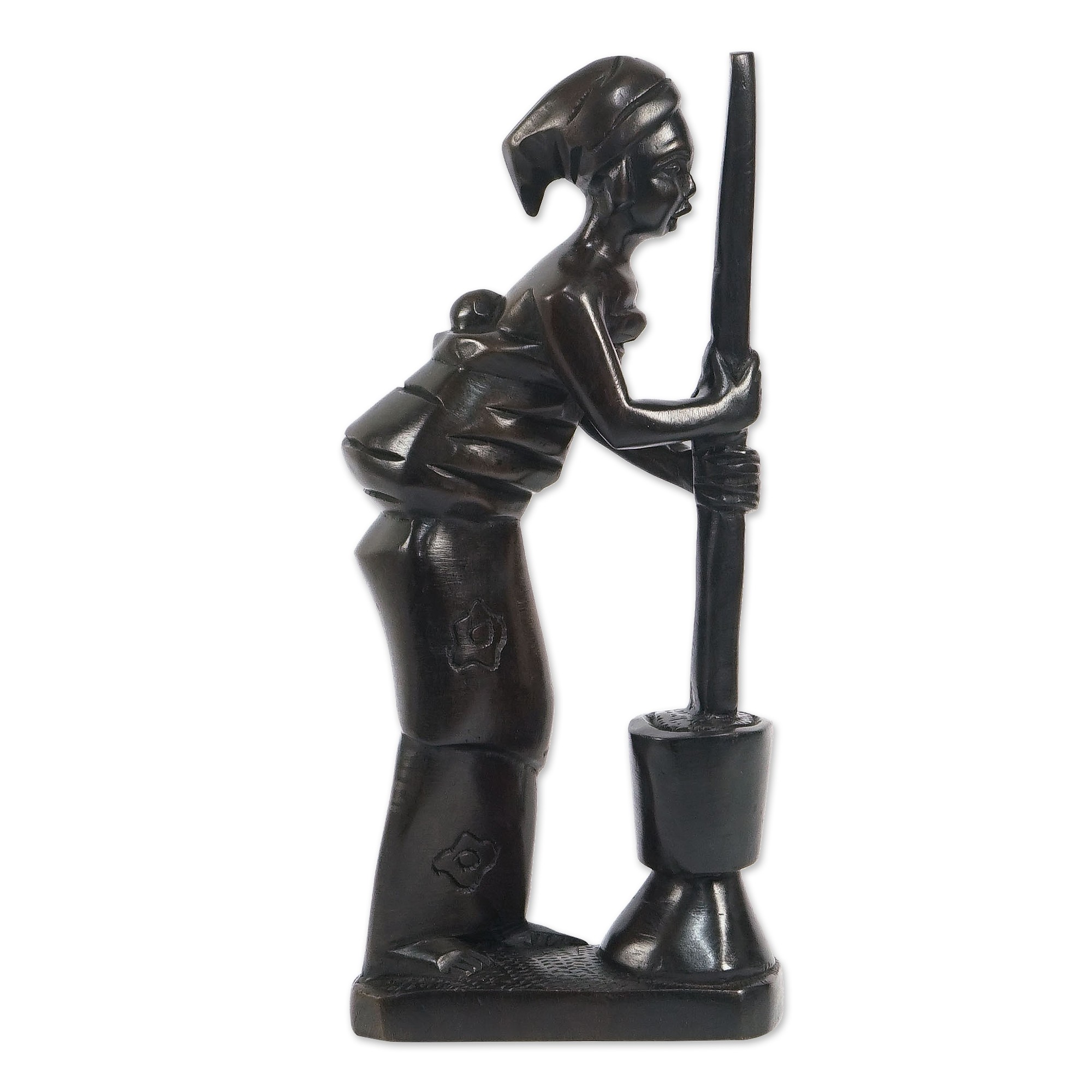 A hardworking African mother pounds nuts while carrying a baby on her back in Agnes Amponsah's stunning sculpture. The Ghanaian artisan hand carves the figures from rich ebony wood in stunning detail, then paints the surface in a polished black that gives the sculpture a sleek look.