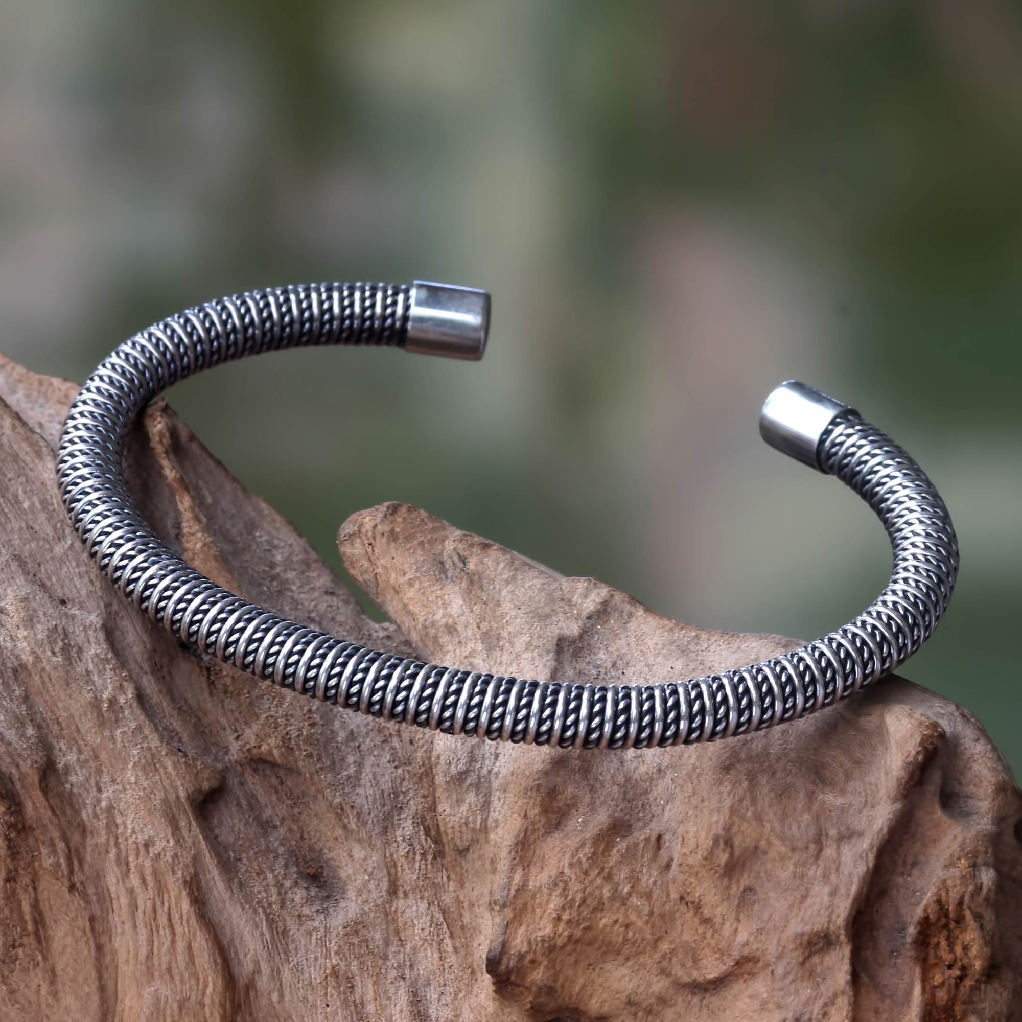 The polished allure of sterling silver contrasts with braided textures in a bracelet from Komang Wijayana. Modern with a touch of tradition, this cuff bracelet is crafted by hand.