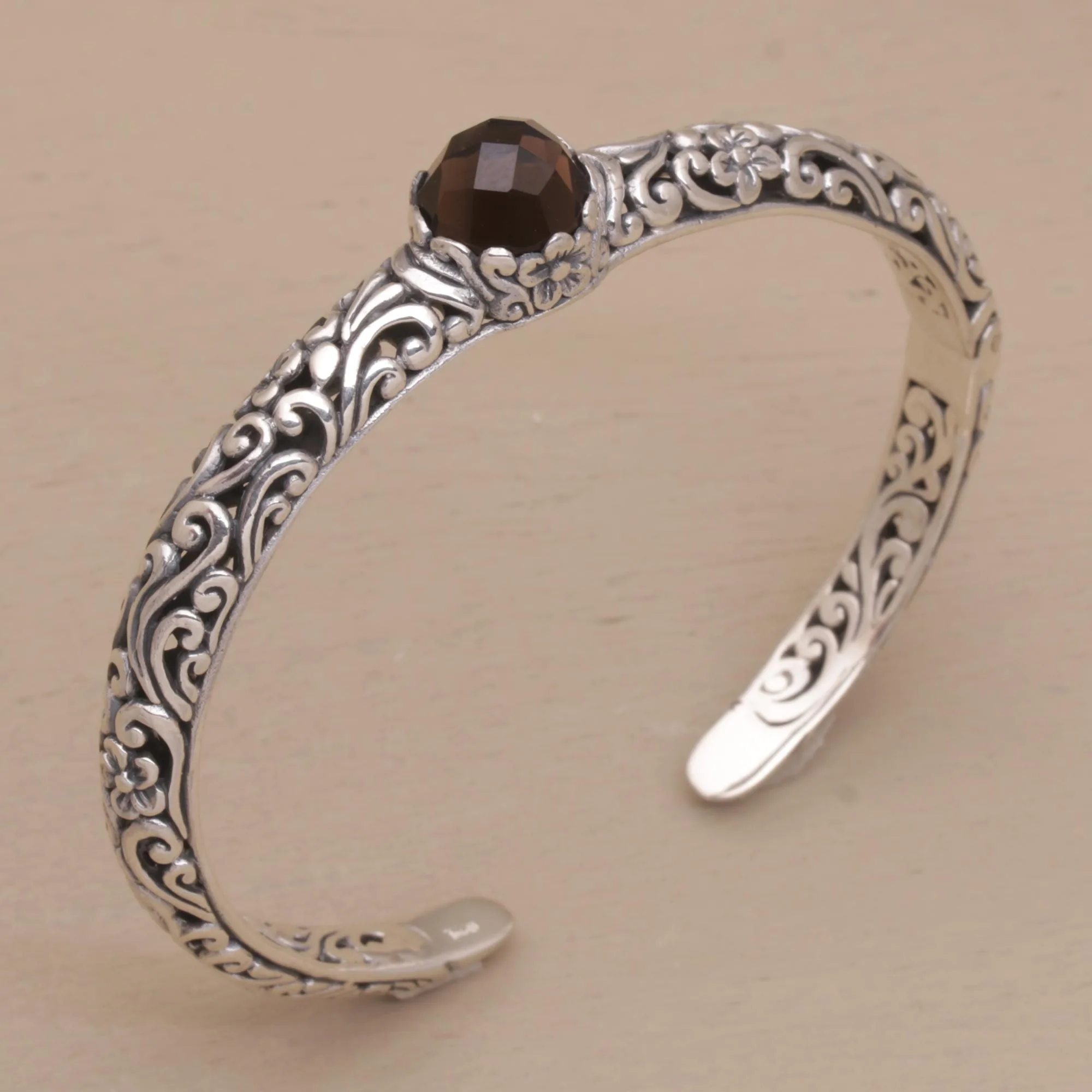 Shining tendrils intertwine to evoke the dense rainforests in Bali. From Komang Wijayana, this feminine bracelet is lovingly crafted by hand with sterling silver. Faceted smoky quartz crowns the slender cuff. It features a concealed hinge at one side for an easy fit.