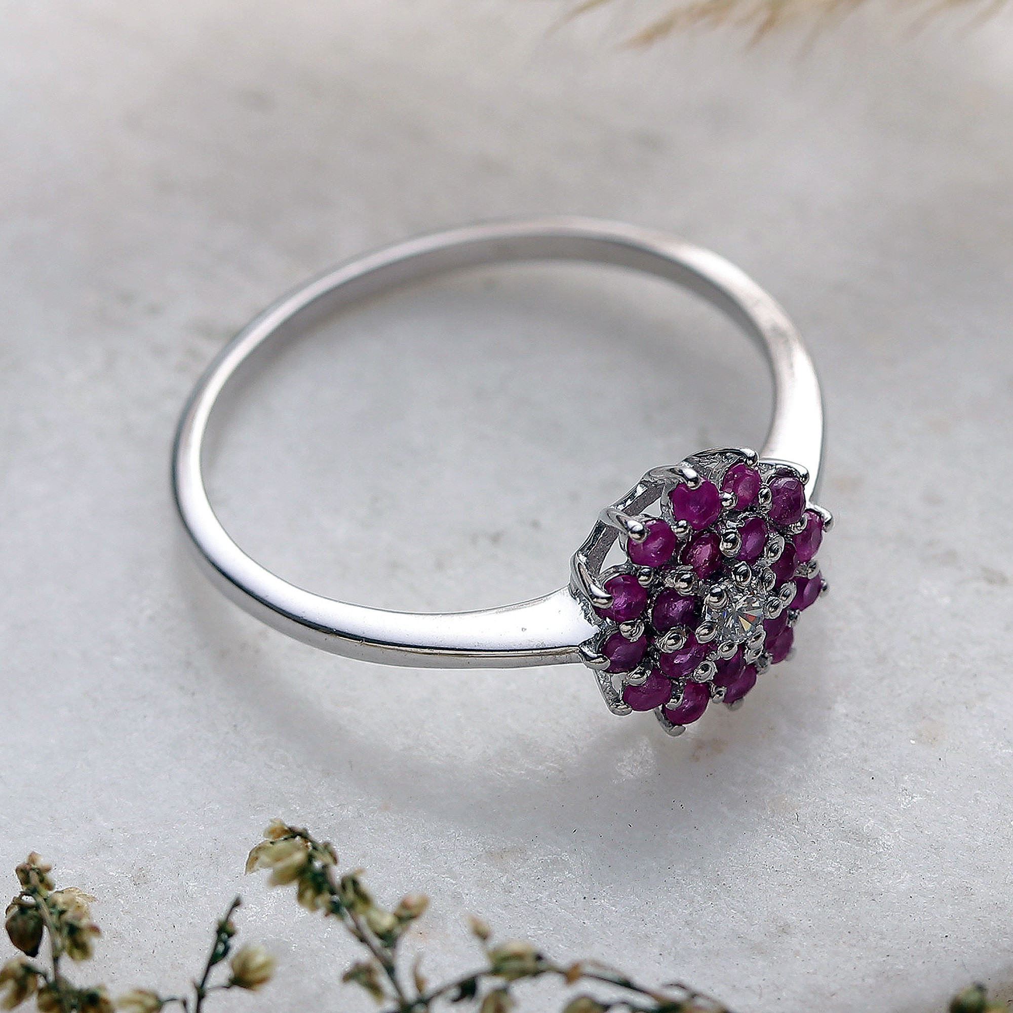 Like tender petals, the purple-pink gemstones on this cocktail ring are too sweet to ignore. Presented by Bhavesh, this rhodium-plated ring is handcrafted by Indian artisans, who create a charming blossom through refined silversmithing work. Faceted ruby stones and a single cubic zirconia form each petal, transforming this sterling silver ring into a luxurious jewelry piece.