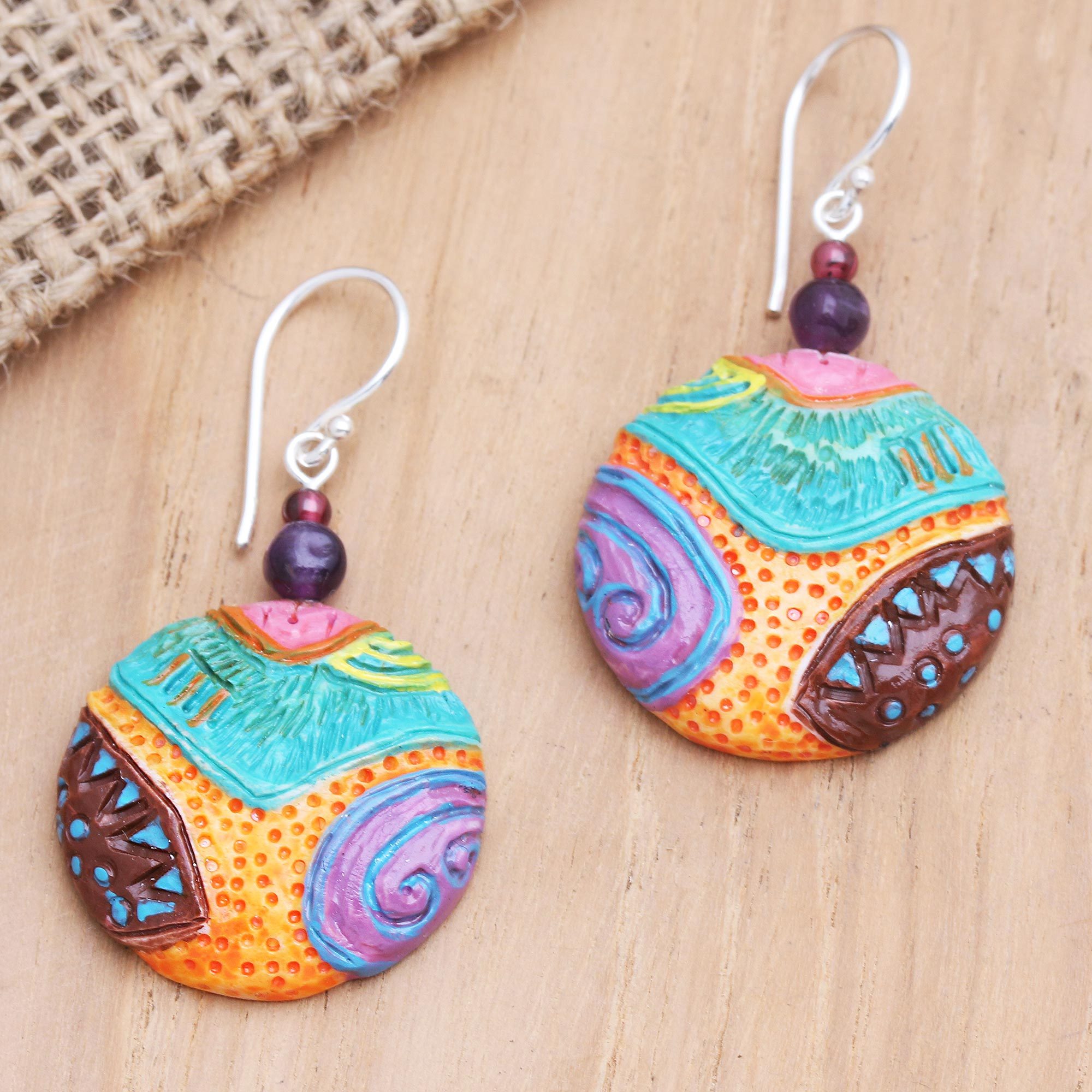 Designed to resemble underwater stones, Ayu Ary's festive dangle earrings are a lovely reimagining of the ocean floor. The Balinese artisan hand paints natural bone to create the colorful earrings, accenting each with an amethyst and garnet bead. Sterling silver hooks provide the pair with the finishing touch.