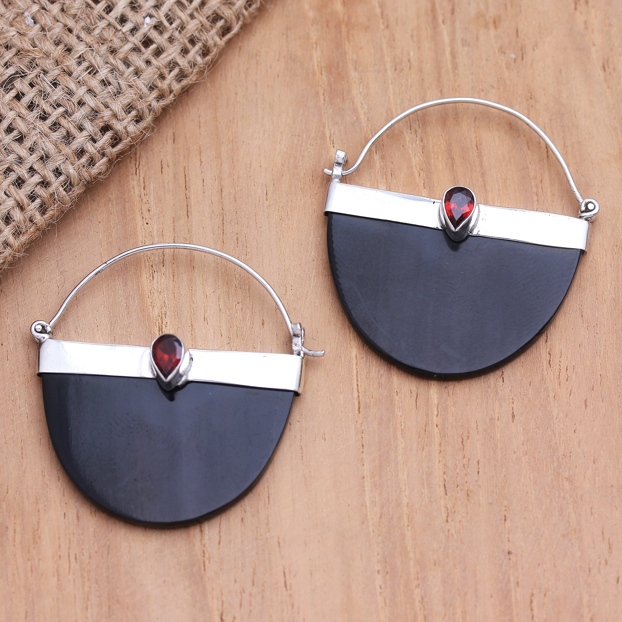 Shaped like sleek black baskets, Ayu Ary's minimalist drop earrings are sure to wow you. The Balinese artisan hand-carves the earrings from natural horn and sets them in sterling silver. A faceted garnet teardrop in a bezel setting shines at the top of the pretty pair.