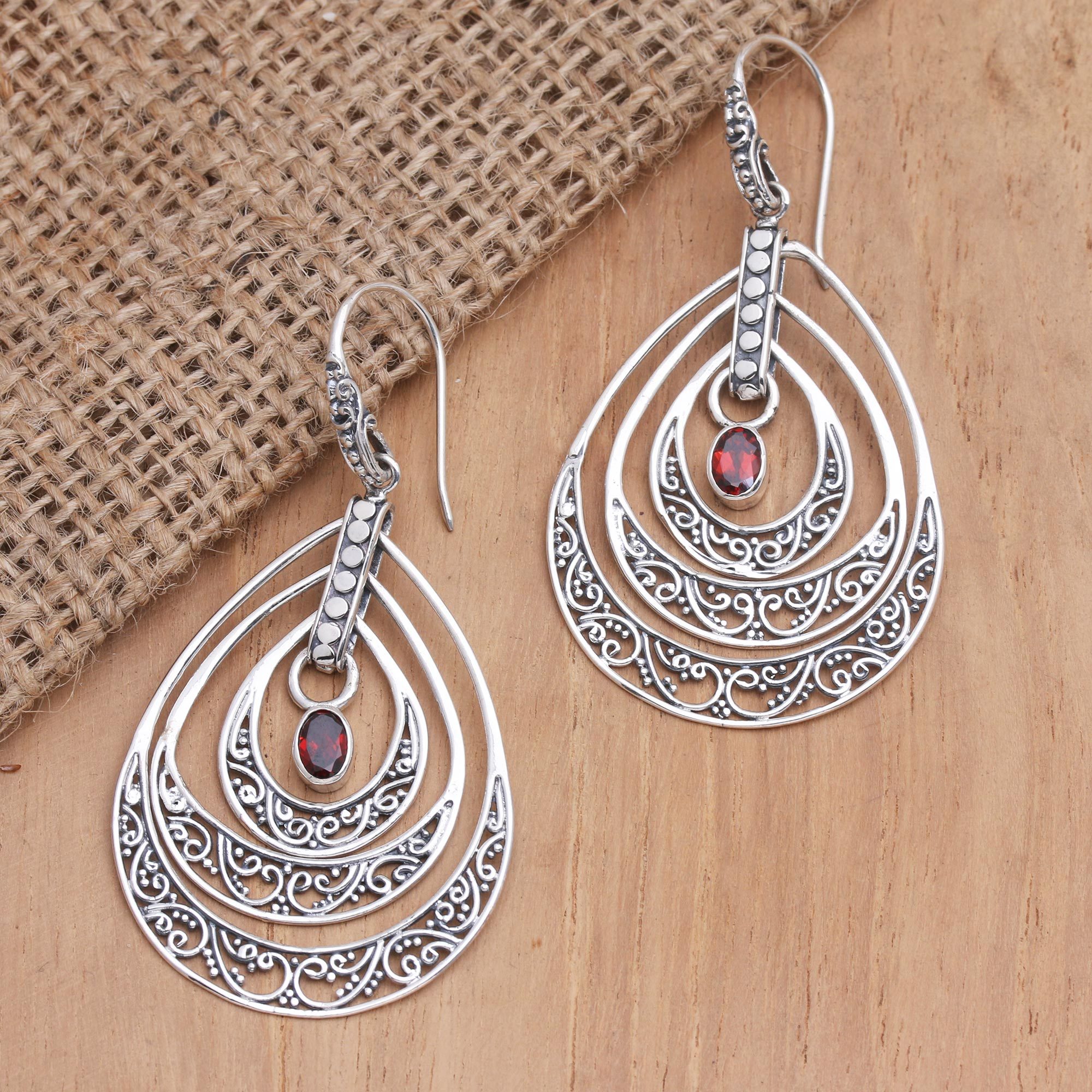 Designed by Anya in Bali, these gorgeous earrings are a sure bet for your next swanky party. The centers each earring with a faceted garnet stone, which dangles inside three concentric pear-shaped hoops. Crafted from sterling silver, the hoops feature openwork designs that lend a baroque touch to the delicate pair.