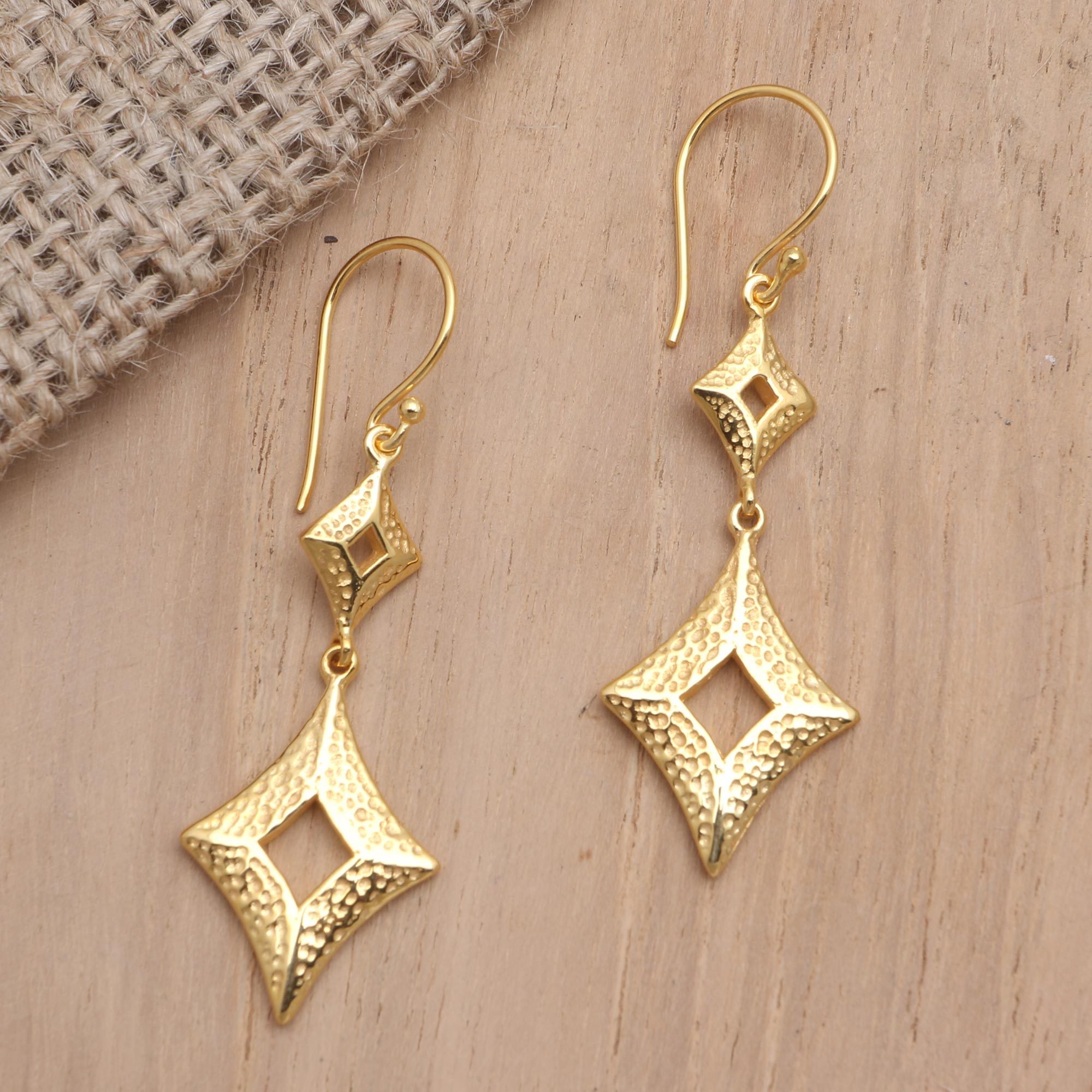 Gold lovers will luxuriate in these gorgeous earrings designed by Bali's Suana Yasa. Crafted from 18k gold-plated brass, the earrings feature two openwork diamond shapes, one large and one small, that dangle prettily from gold-plated hooks.