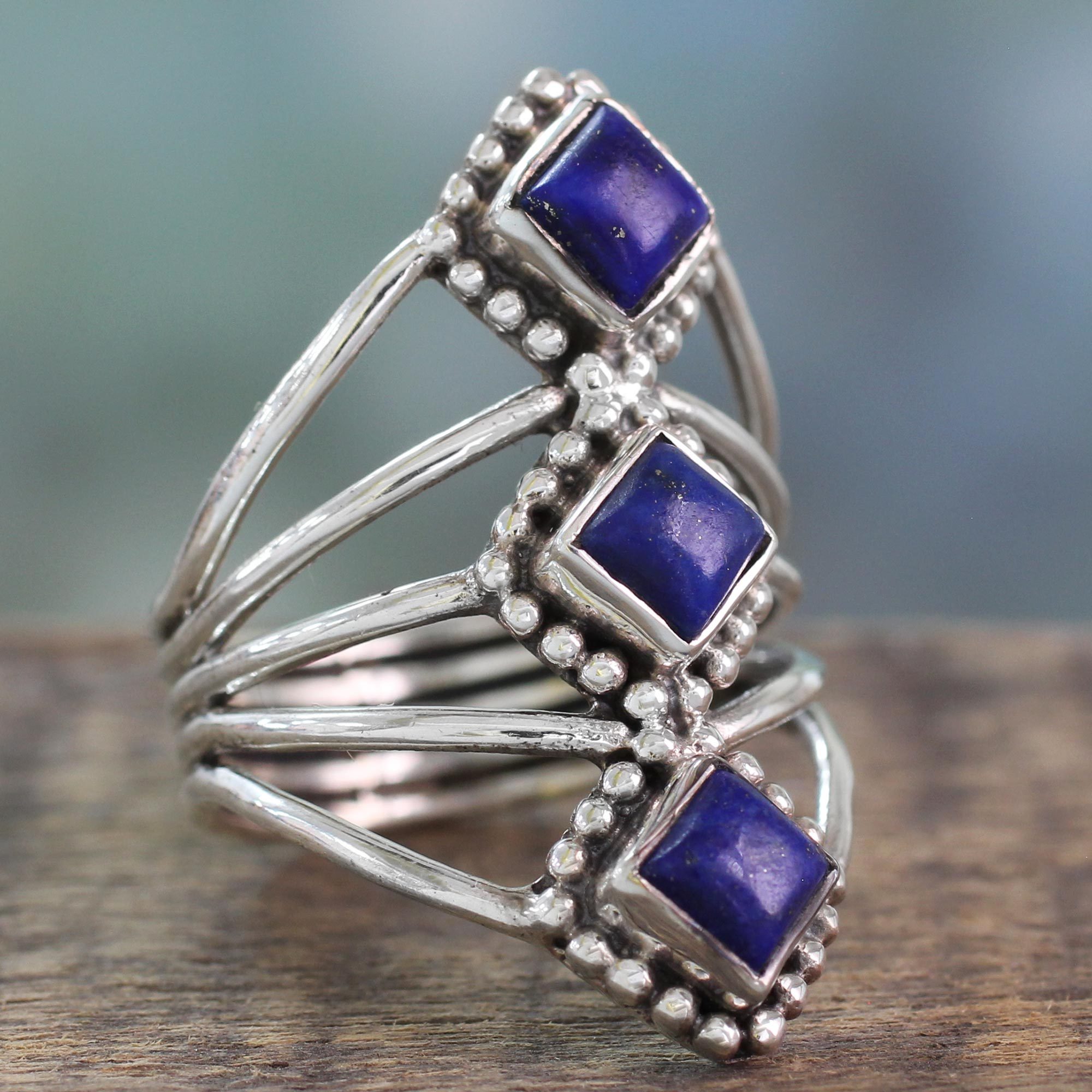 Artisan Crafted Lapis Lazuli and Silver Ring from India, 'Deep Blue Diamonds'