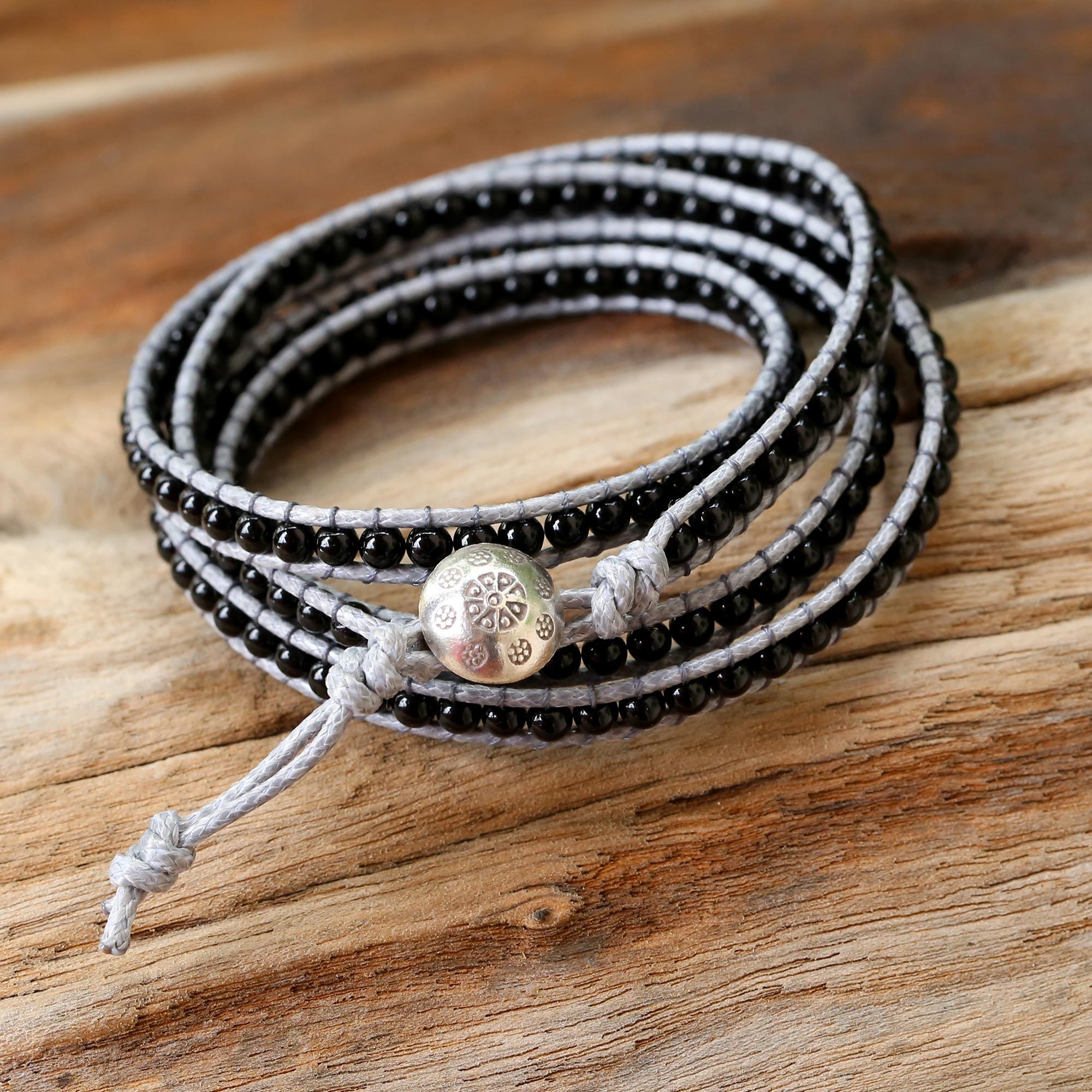 Thailand's Siriporn evokes the night's mystical glow as selects black agate, the May birthstone, for this wrap bracelet. Designed to wrap several times around the wrist, the handcrafted bracelet can be fastened at two different lengths with a black agate button.