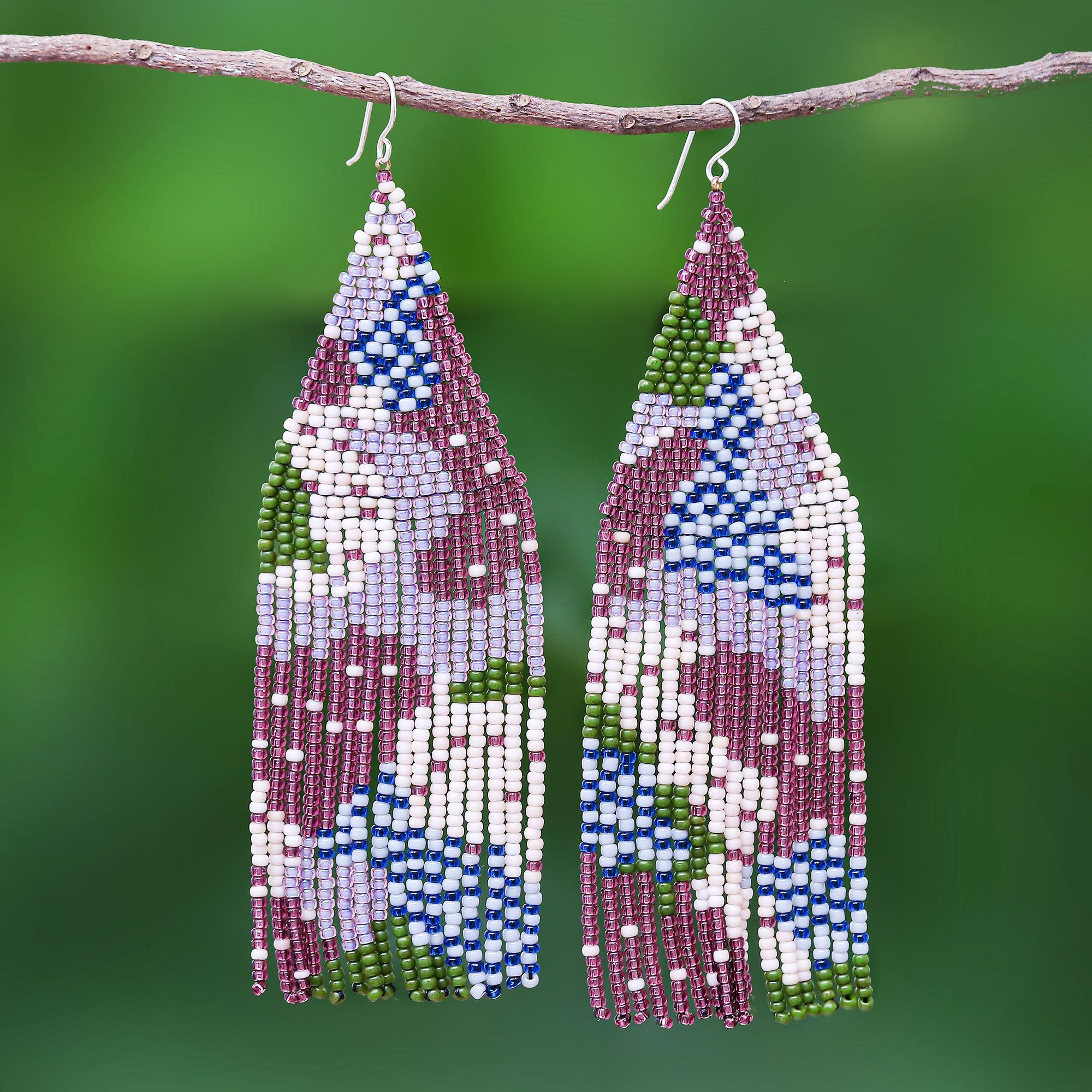 These dazzling extra-long earrings are designed by Siriporn in Thailand. Artisans thread tiny glass beads in dark purple, light purple, blue, green and cream colors, creating a waterfall design. The earrings swing from sterling silver hooks.