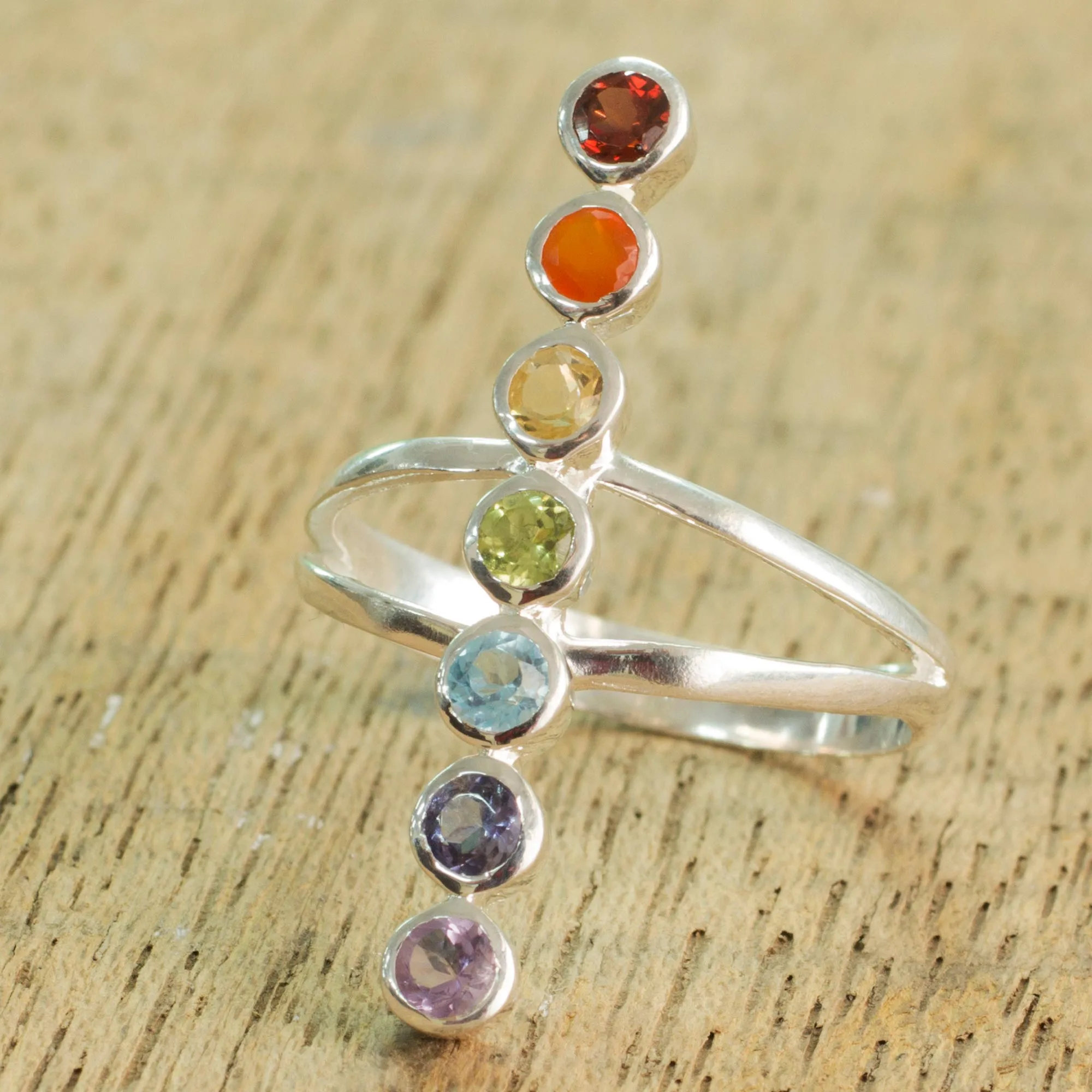 Beautifully aligned in a single row, radiant gemstones in various colors shine ever so brightly. Alok Jain of India presents this stunning sterling silver ring adorned with round gemstones, a lovely accessory to any ensemble.