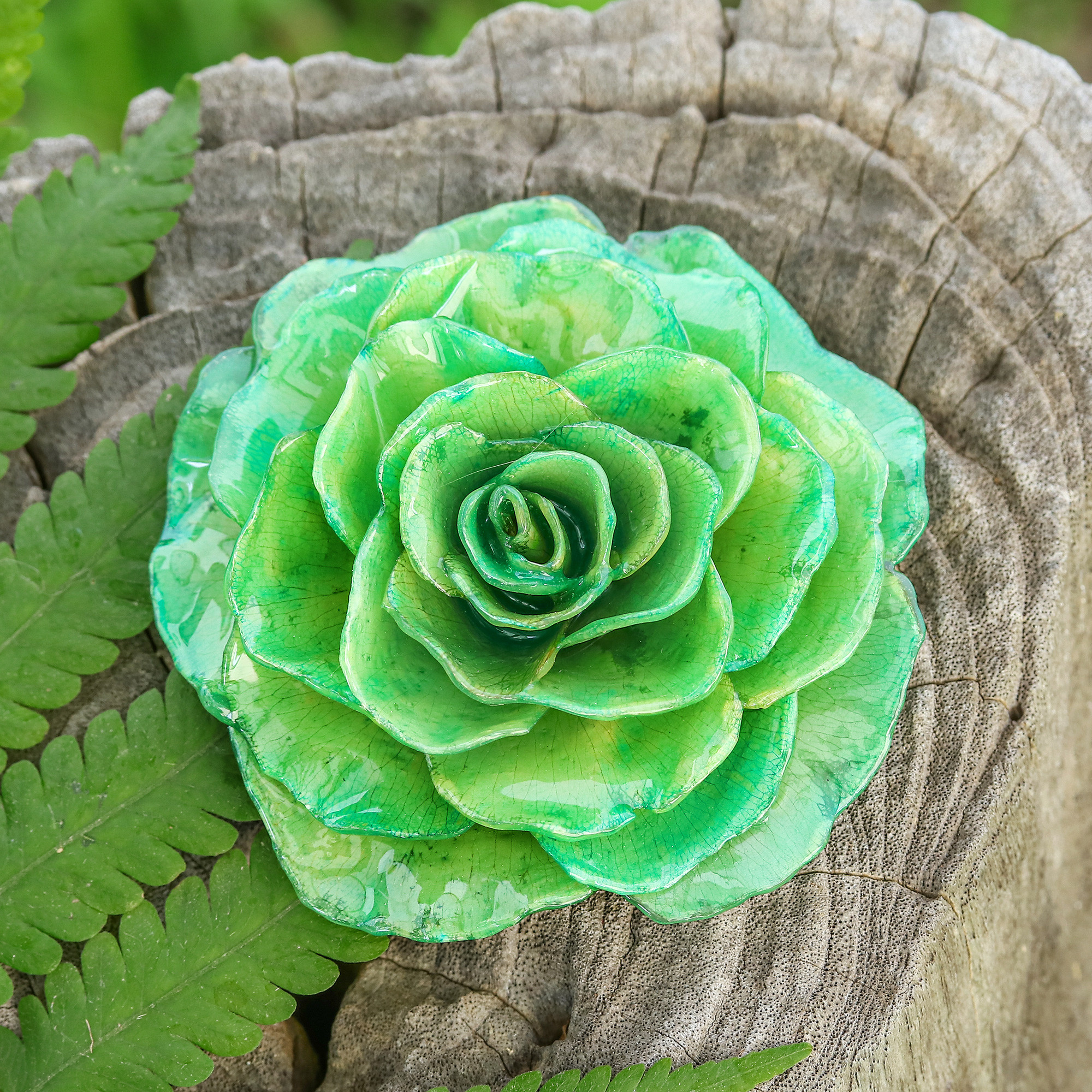 Artisan Crafted Natural Rose Brooch in Green from Thailand, 'Rosy Mood in Green'