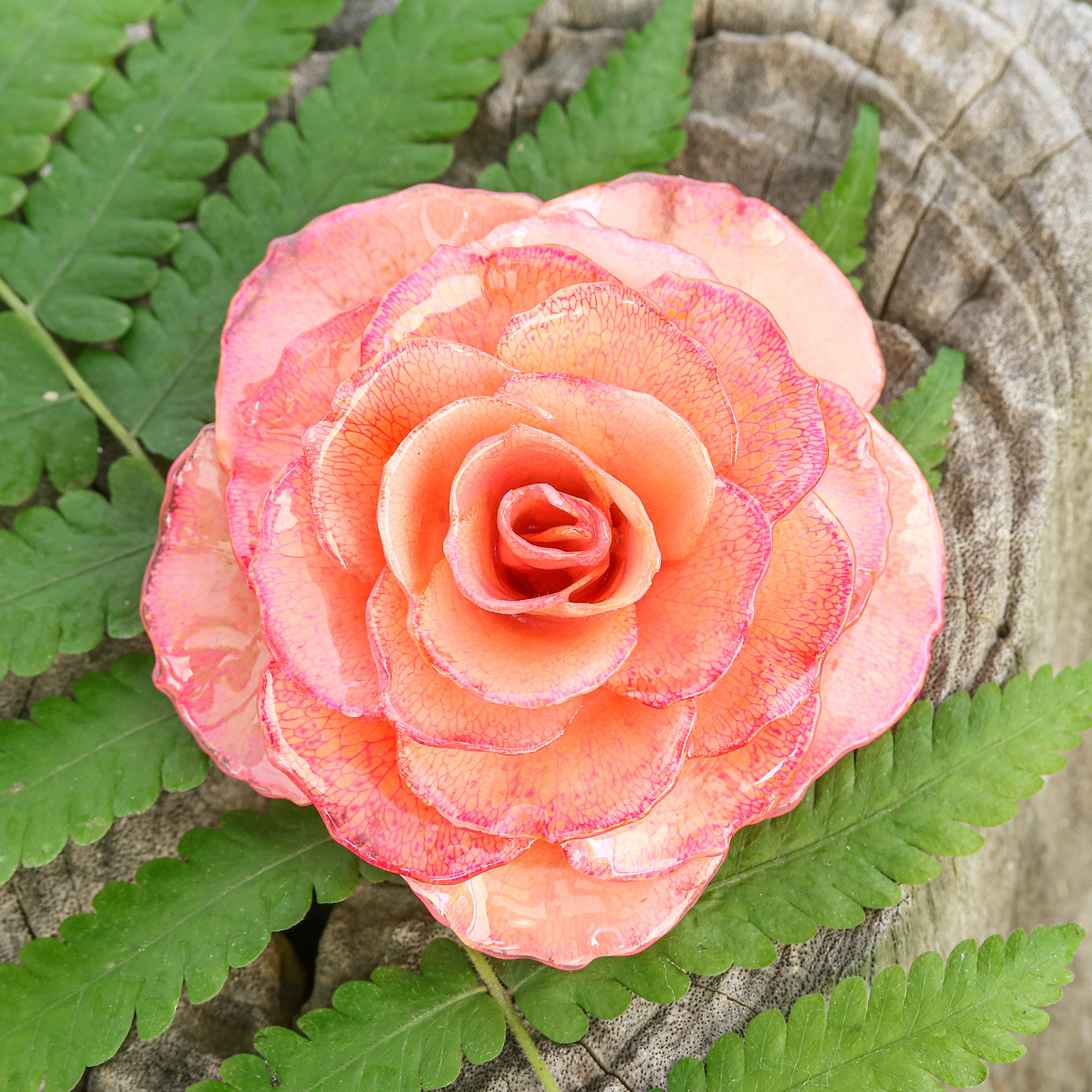 • Resin coated dyed natural rose, 22k gold plated brass pin