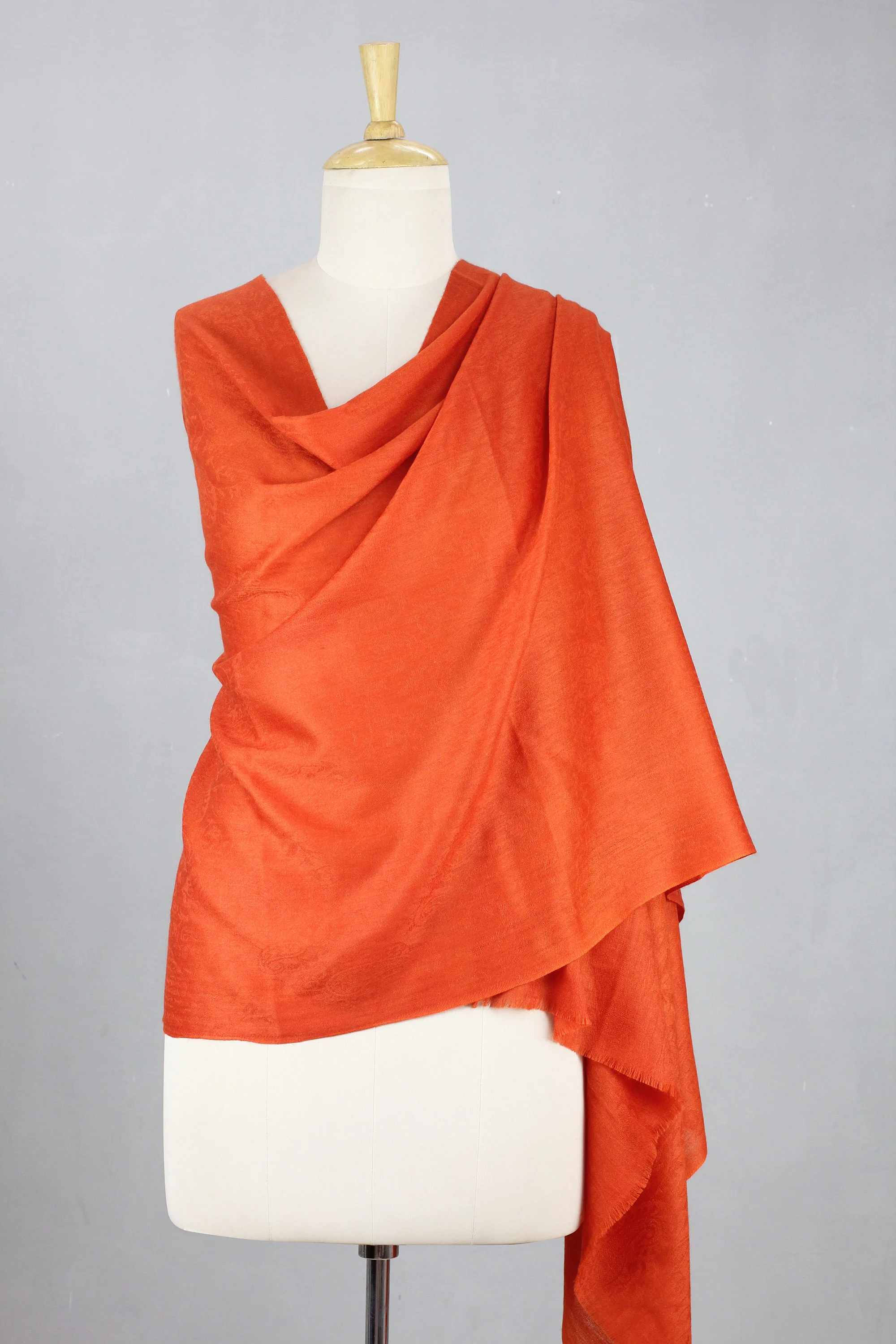 Rich orange color brings glamour to a hand-loomed wool shawl from Sajad in India. The shawl features a subtle paisley jacquard pattern that makes it a versatile accessory for both casual and dressy occasions. The shawl is finished on both ends with a short fringe.