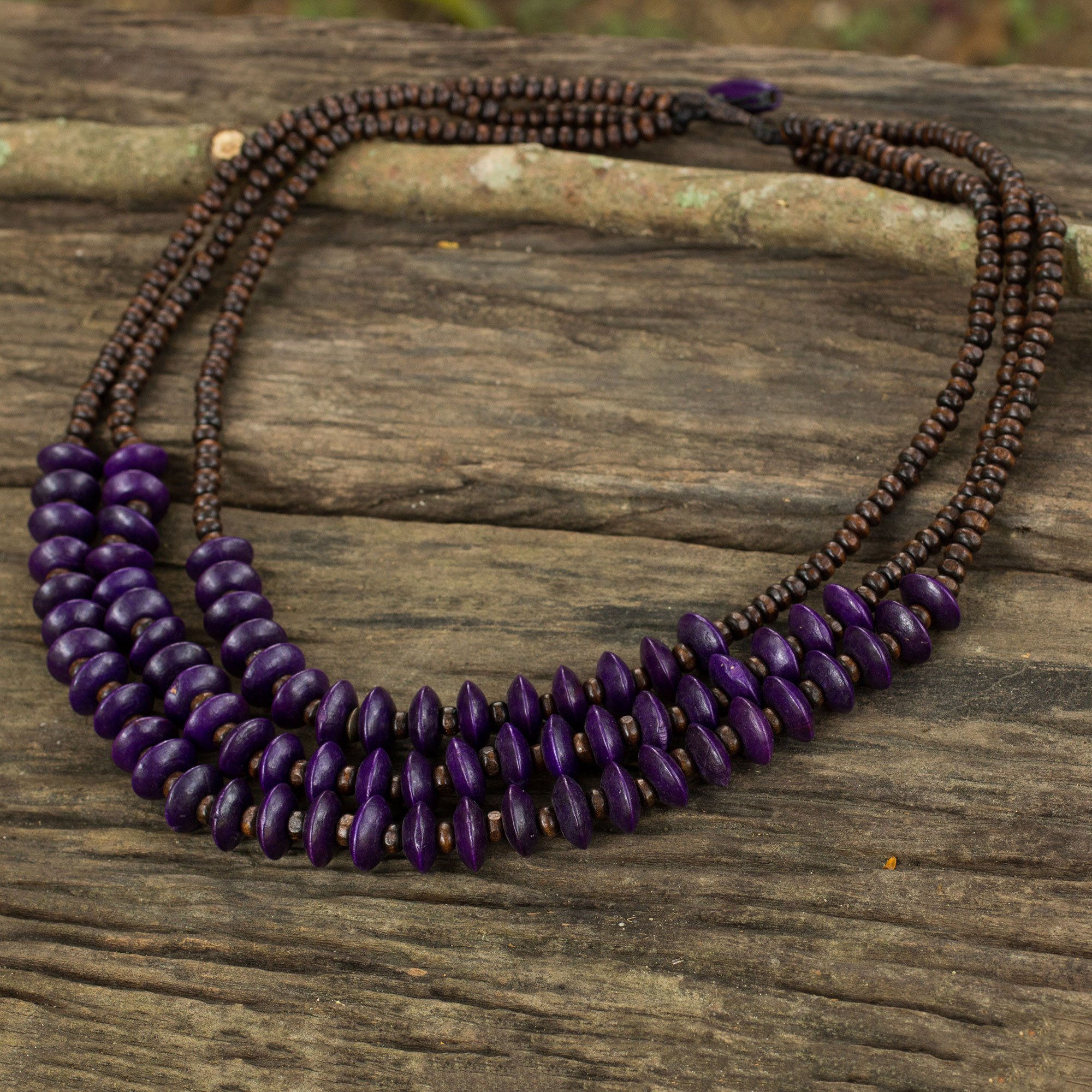 Sumalee Nawakul reveals a waterfall of color with the design of this necklace. In brown and purple, the necklace is crafted by hand with littleleaf boxwood beads.
