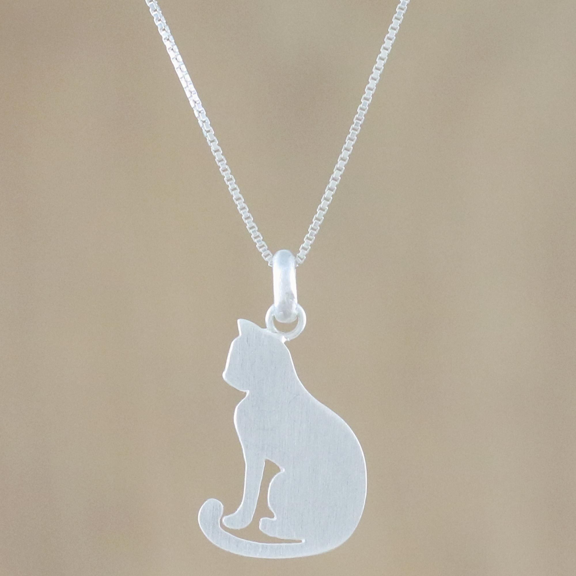 Artisan Crafted Silver Cat Necklace with Brushed Finish, 'Cat's Shadow'