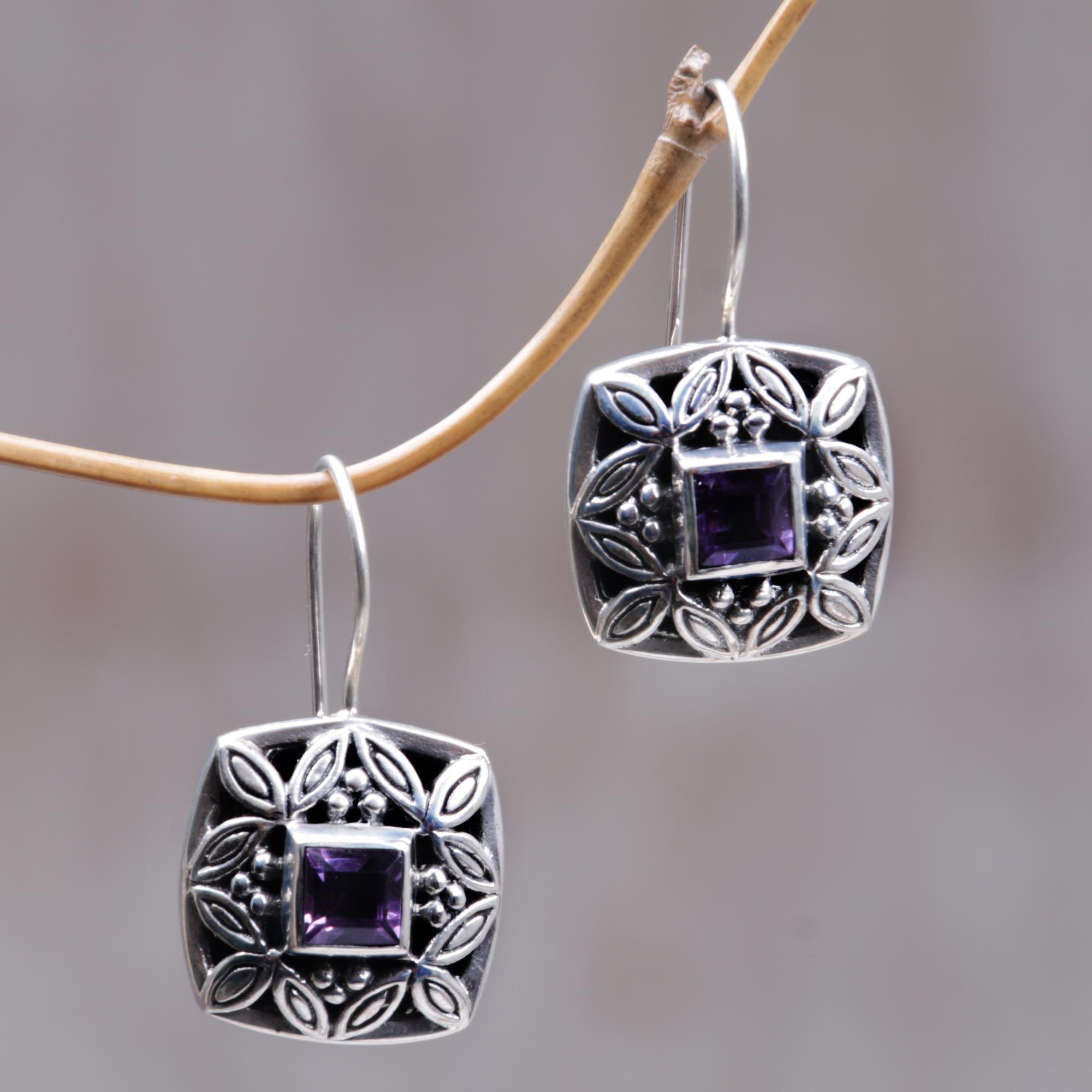 Artisan Crafted Sterling Silver and Amethyst Earrings , 'Dazzling Leaves '