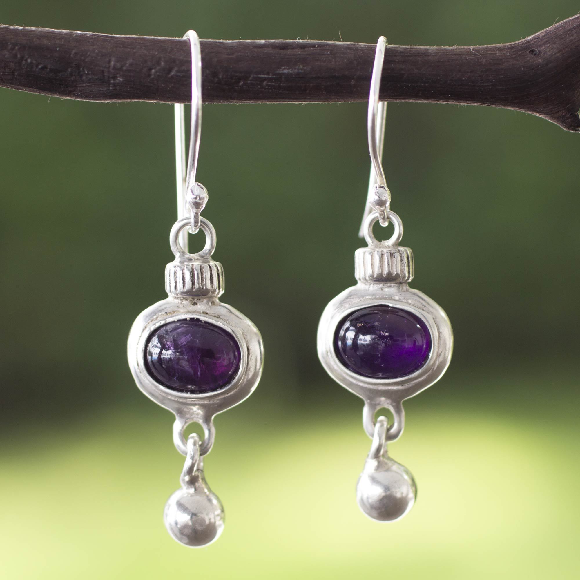 "I created the design of these earrings thinking of birds with long feathers, like the quetzal," says Mariana Llanes as she reveals her inspiration. She selects the deep violet glow of amethyst cabochons to center the handcrafted sterling silver earrings.