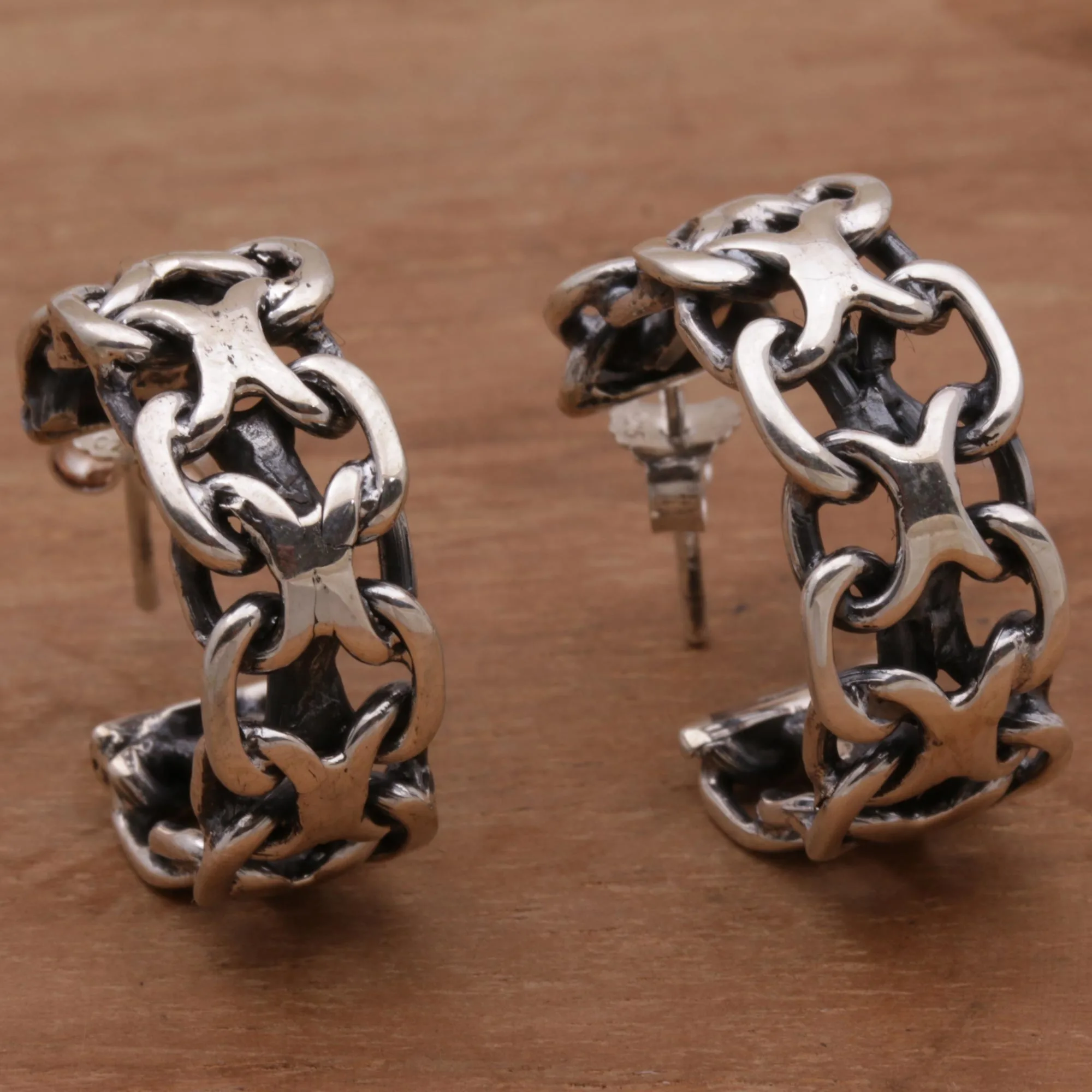 Intricate chain motifs loop below the ears in this pair of earrings from Bali. Wayan Asmana presents the half-hoop earrings, crafted by local artisans of sterling silver with a combination of finishes.