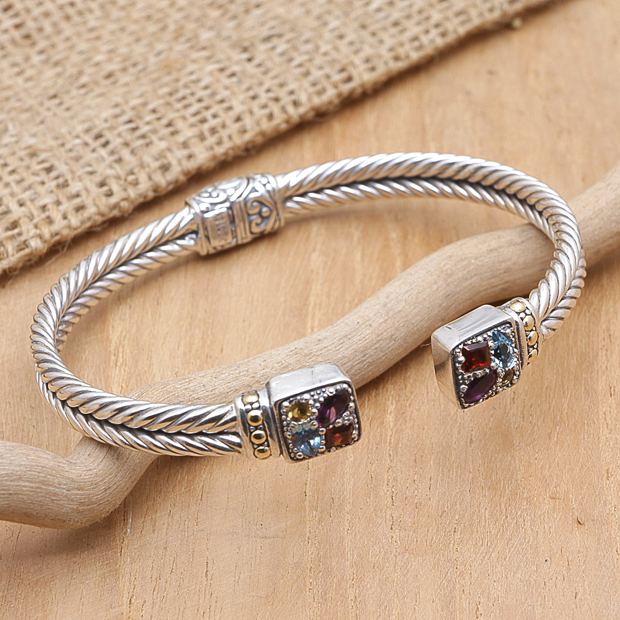Balinese artisan Wayan Neri presents this luxurious cuff bracelet with a classic twin rope motif. This sterling silver bracelet with an engraved concealed hinge is accented with blue topaz, garnet, citrine, and amethyst gemstones, giving this timeless piece a modern flair.