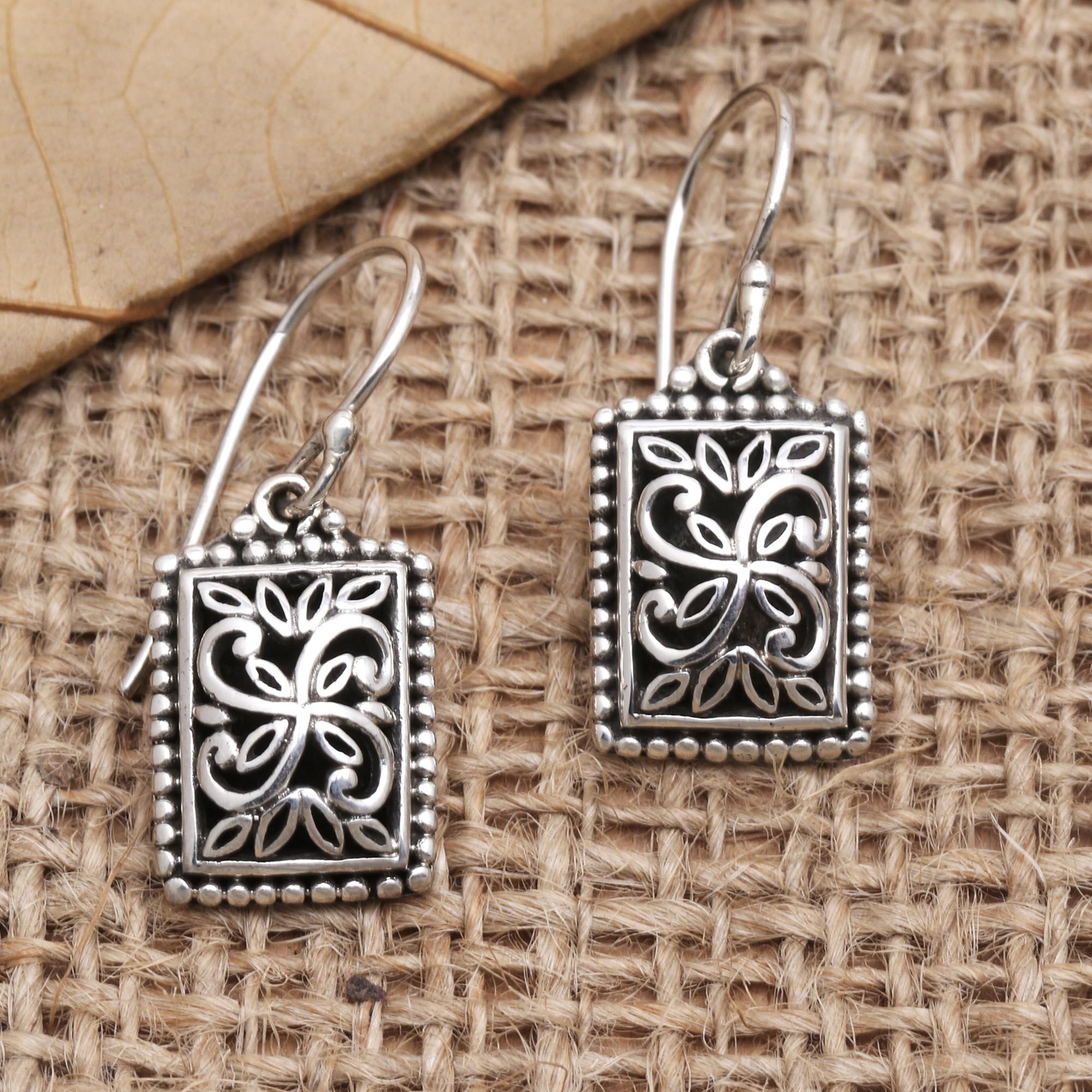 Simple yet stunning, these earrings designed by Balinese artisan Made Mustika are an easy choice for busy mornings. Inside a rectangular frame, sterling silver openwork designs curl and shine in the light. Silver dot work borders the rectangle for a decorative touch, while sterling silver hooks finish the pair.