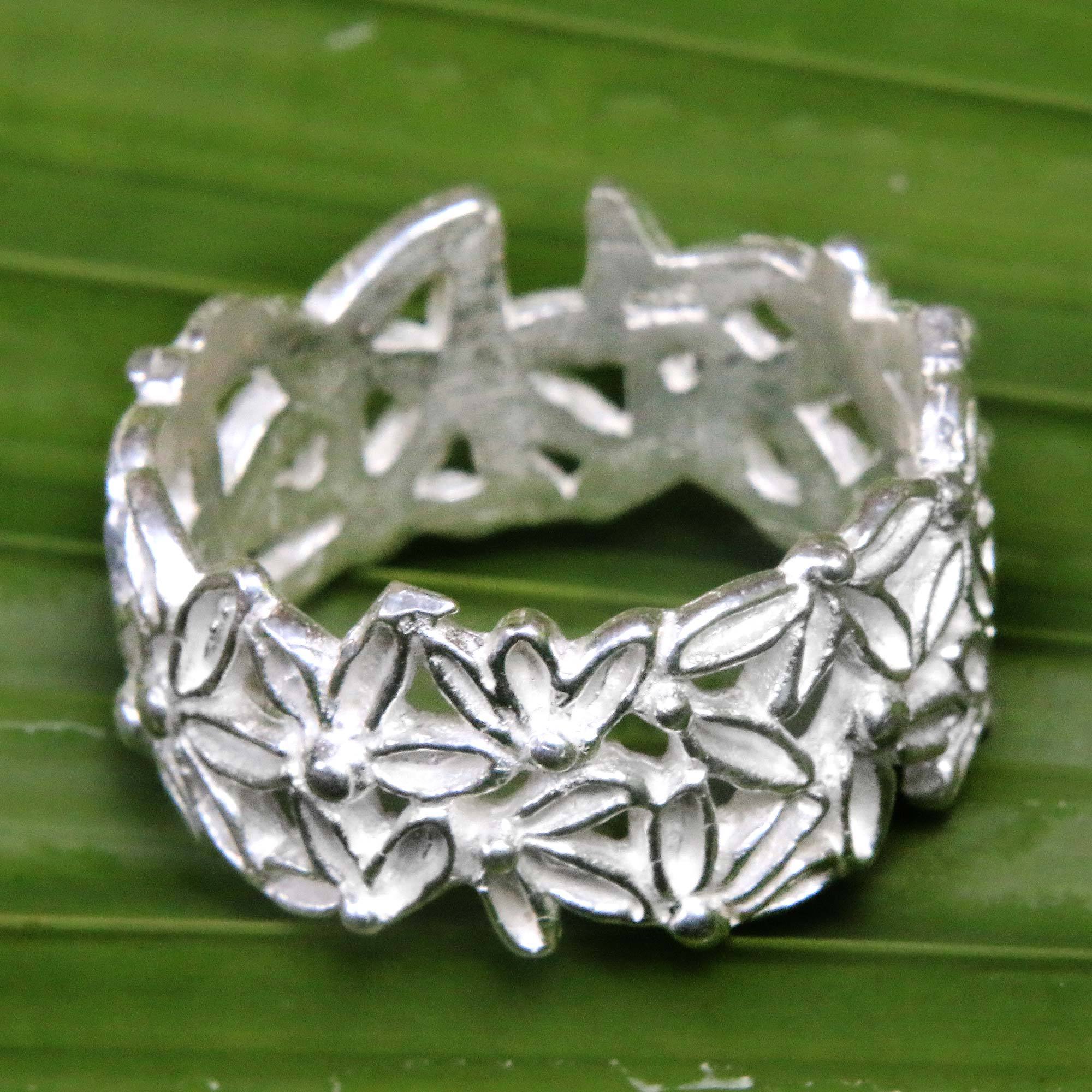 Delicate frangipani blossoms dance in a circle in this exquisite sterling silver ring presented by Desi Antari. This floral ring with a thick band is a stunning accessory for any day.