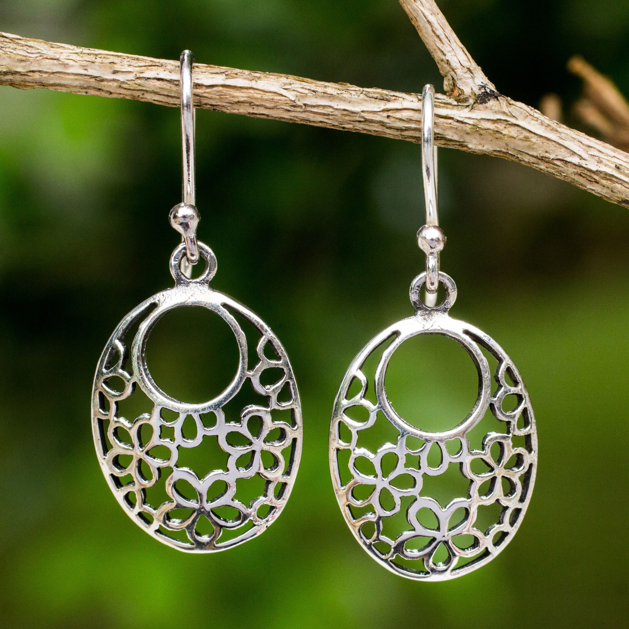 Blossoming flowers shine through the openwork of this oval shaped hook earrings. From Wadarat Supasirisuk, the earrings are crafted of sterling silver