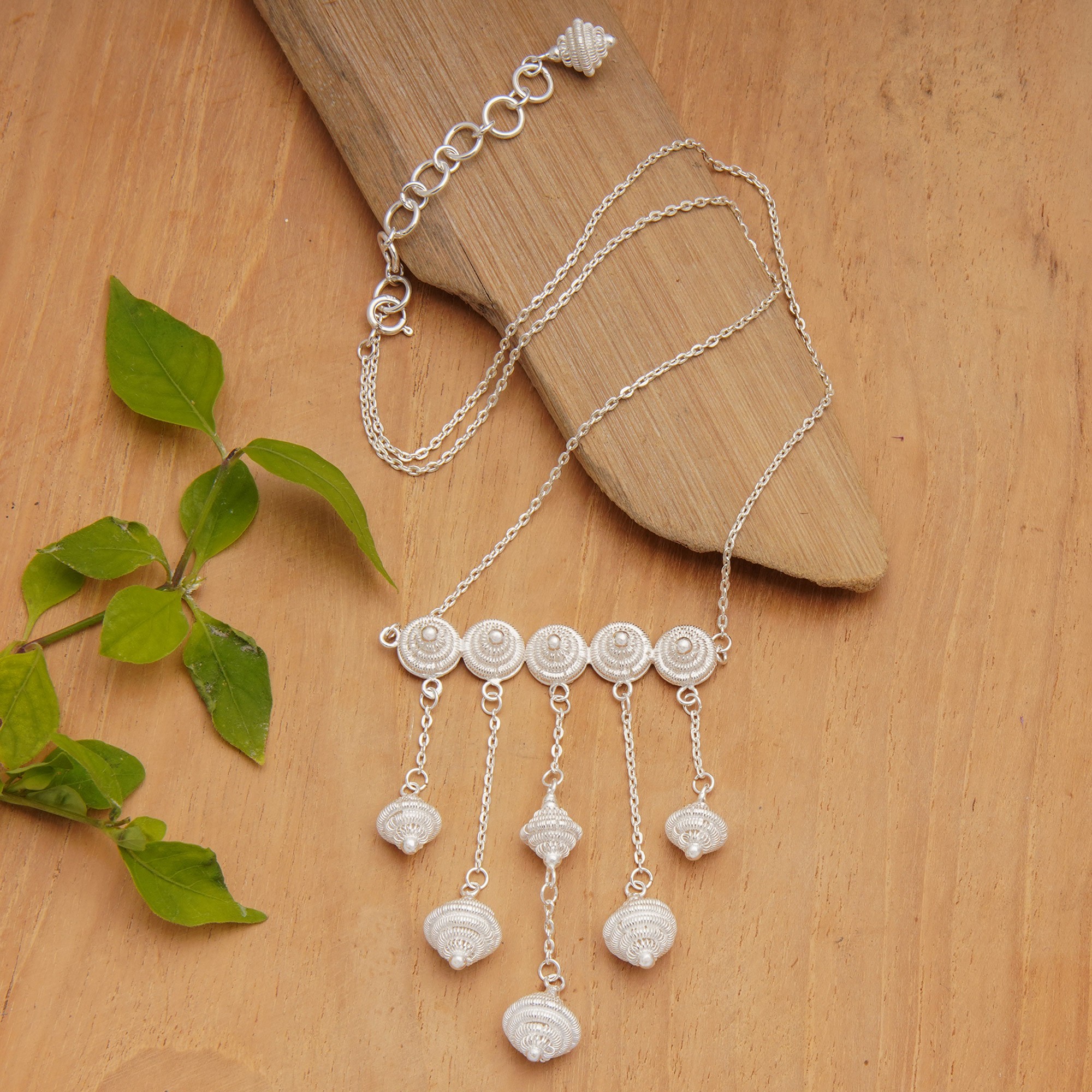 Inspired by stupa, the dome-shaped Buddhist temples of Indonesia, Javanese artisan Selly Sagita designs a luxurious necklace. The pendant is formed by a row of domed sterling silver shapes with elegant pyramid forms dangling below.