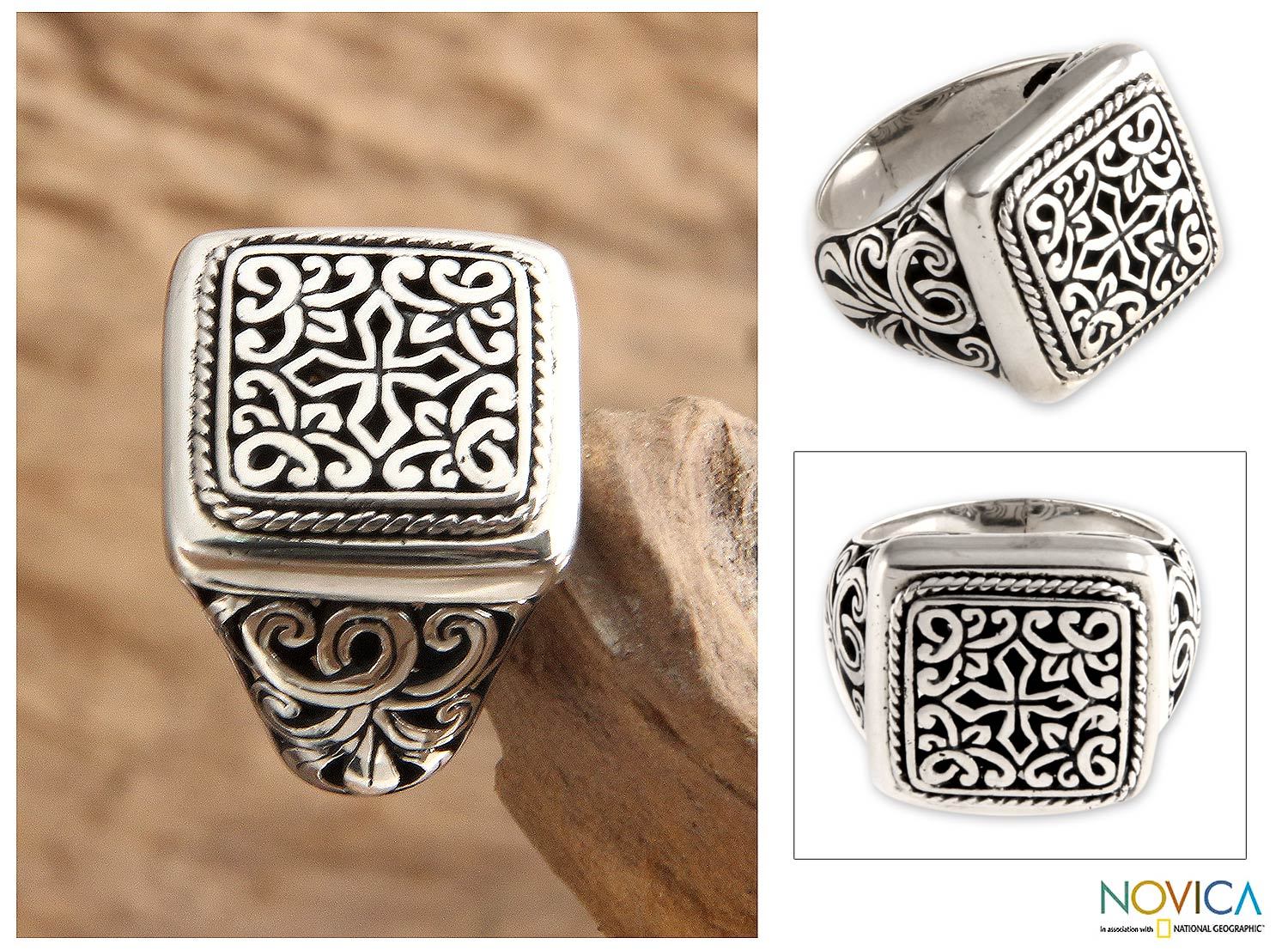 The elegance of traditional Indonesian art graces an exquisite ring by Kadek Hendra. Handcrafted of silver, the ornate crown is centered by a cross. Swirling across the design, lavish tendrils evoke a Balinese garden.