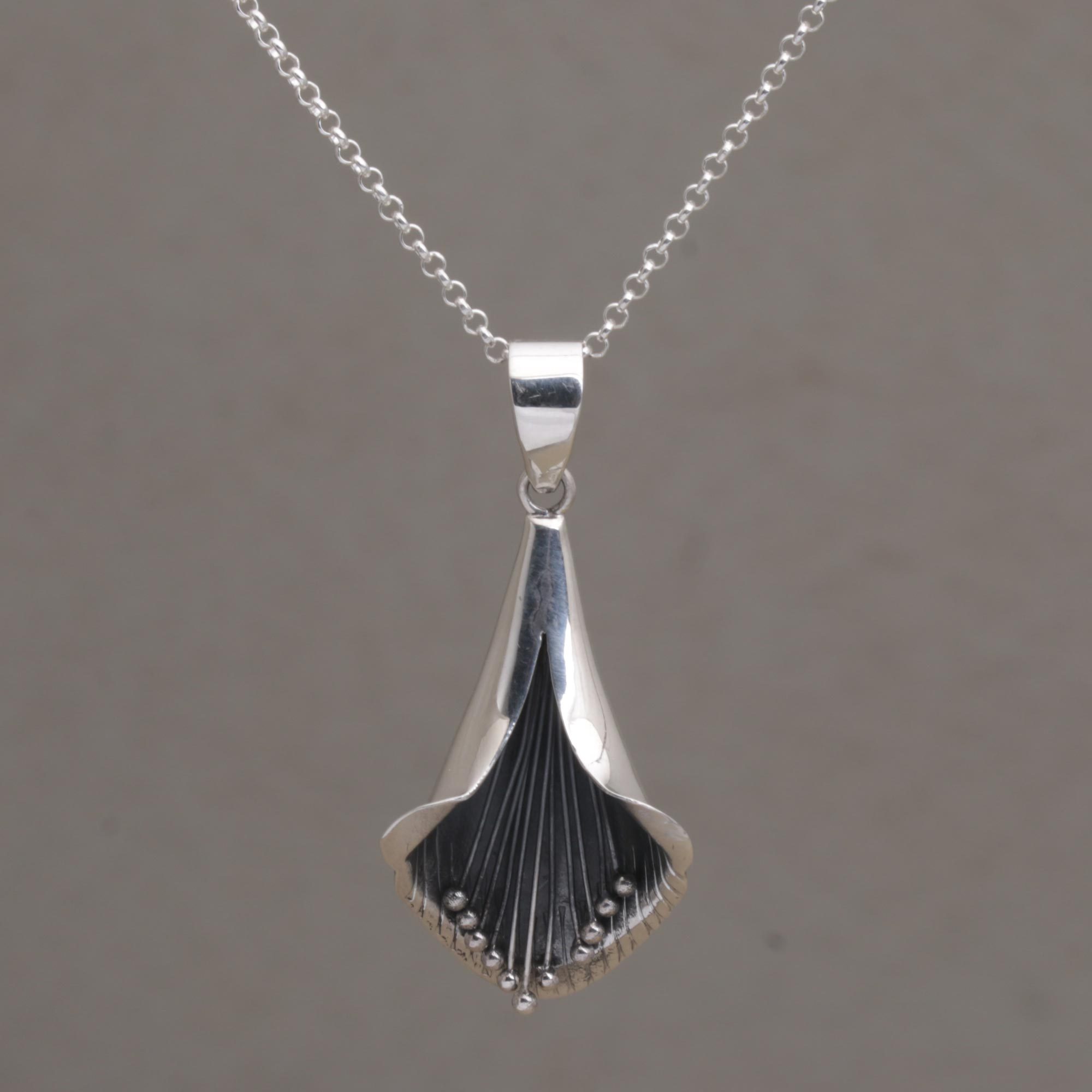 Artisan Nyoman Rena of Bali presents a pendant necklace that depicts a graceful trumpet-like flower. The pendant is crafted of sterling silver and beautifully detailed, from the delicate stamens within to the petals' curled edges. The pendant centers a classic sterling silver rolo chain.