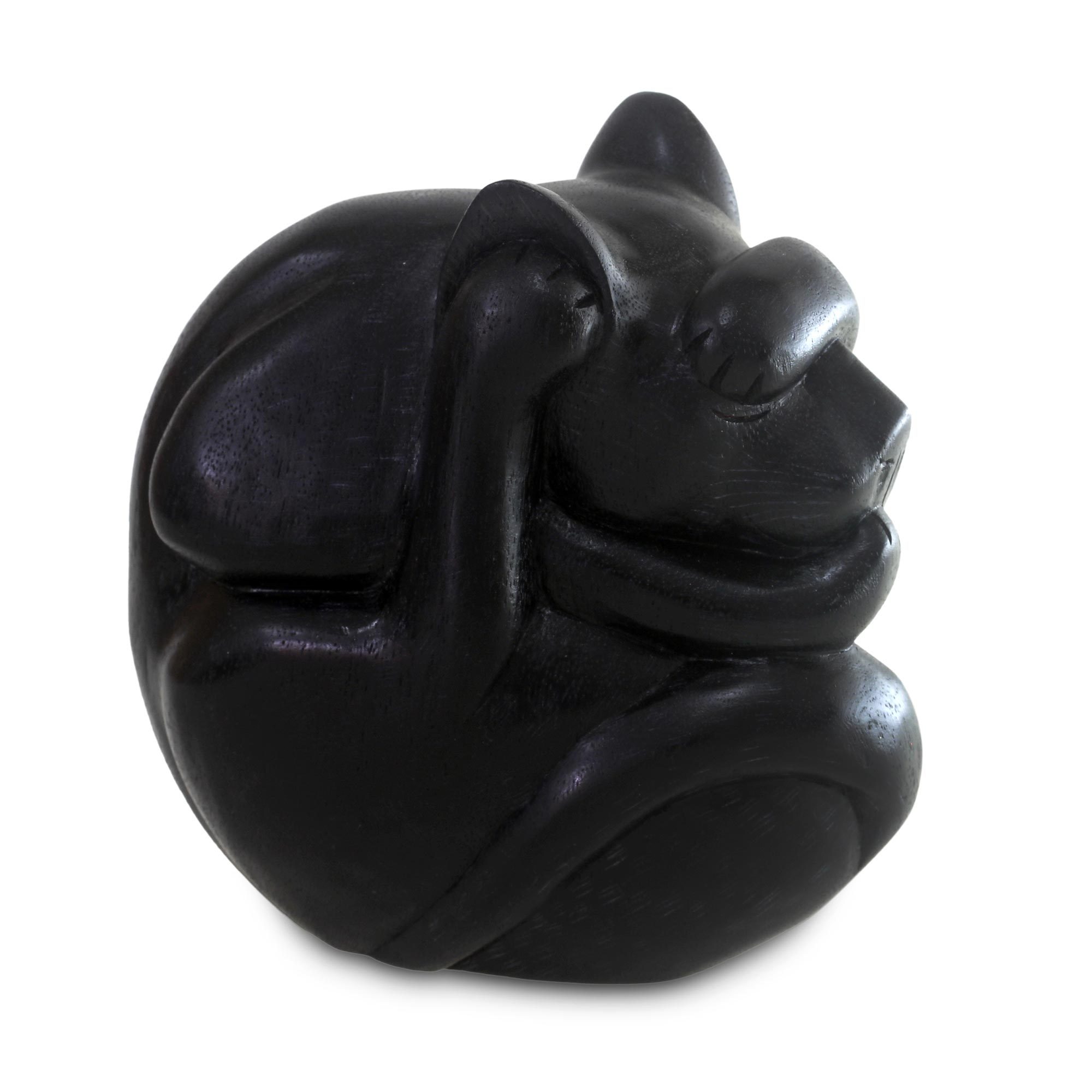 Artisan Crafted Wood Sculpture, 'Black Yogi Cat'