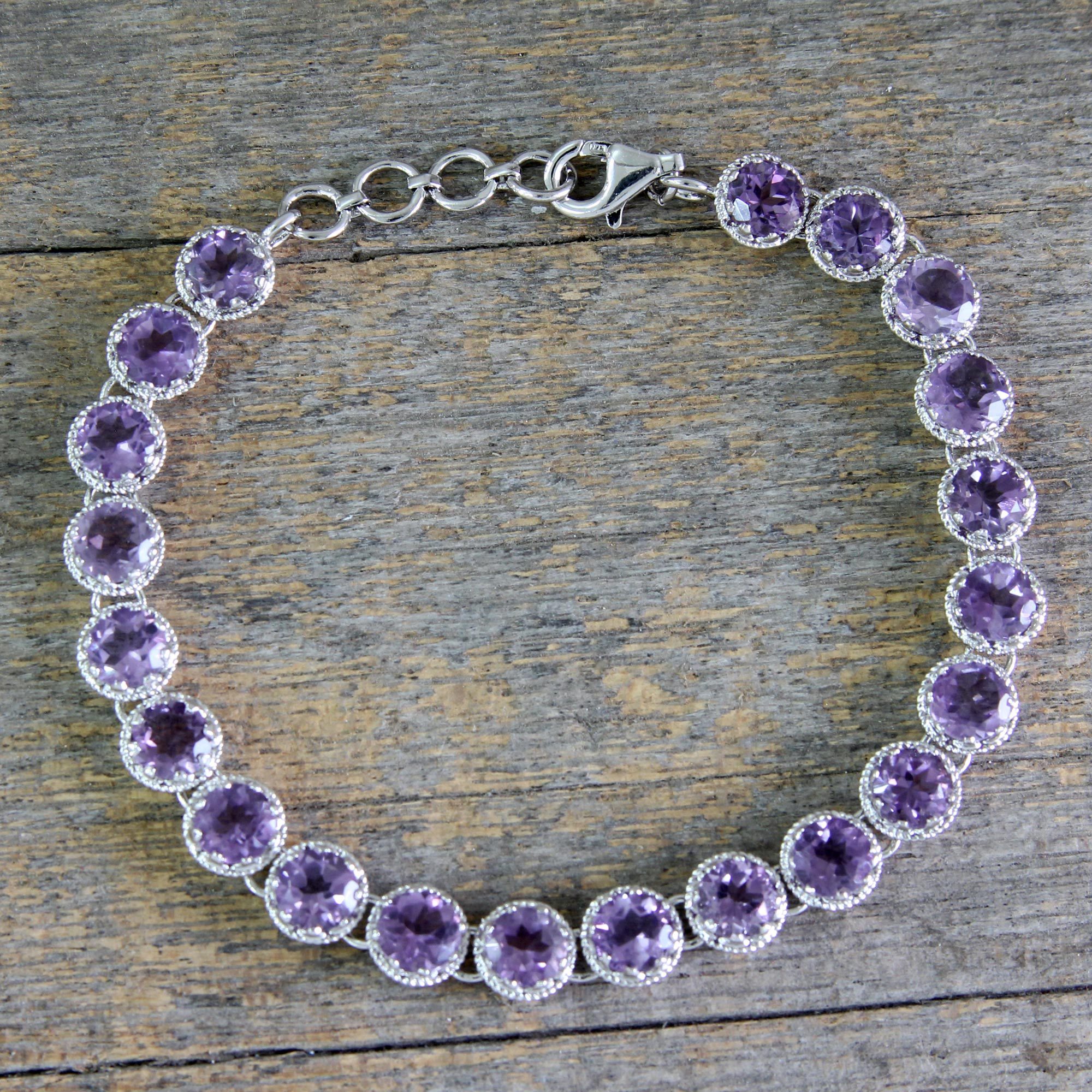Faceted amethysts sparkle in a tennis bracelet from Alok Jain in India. Handcrafted of sterling silver, this extraordinary bracelet features stones totaling 21 carats.