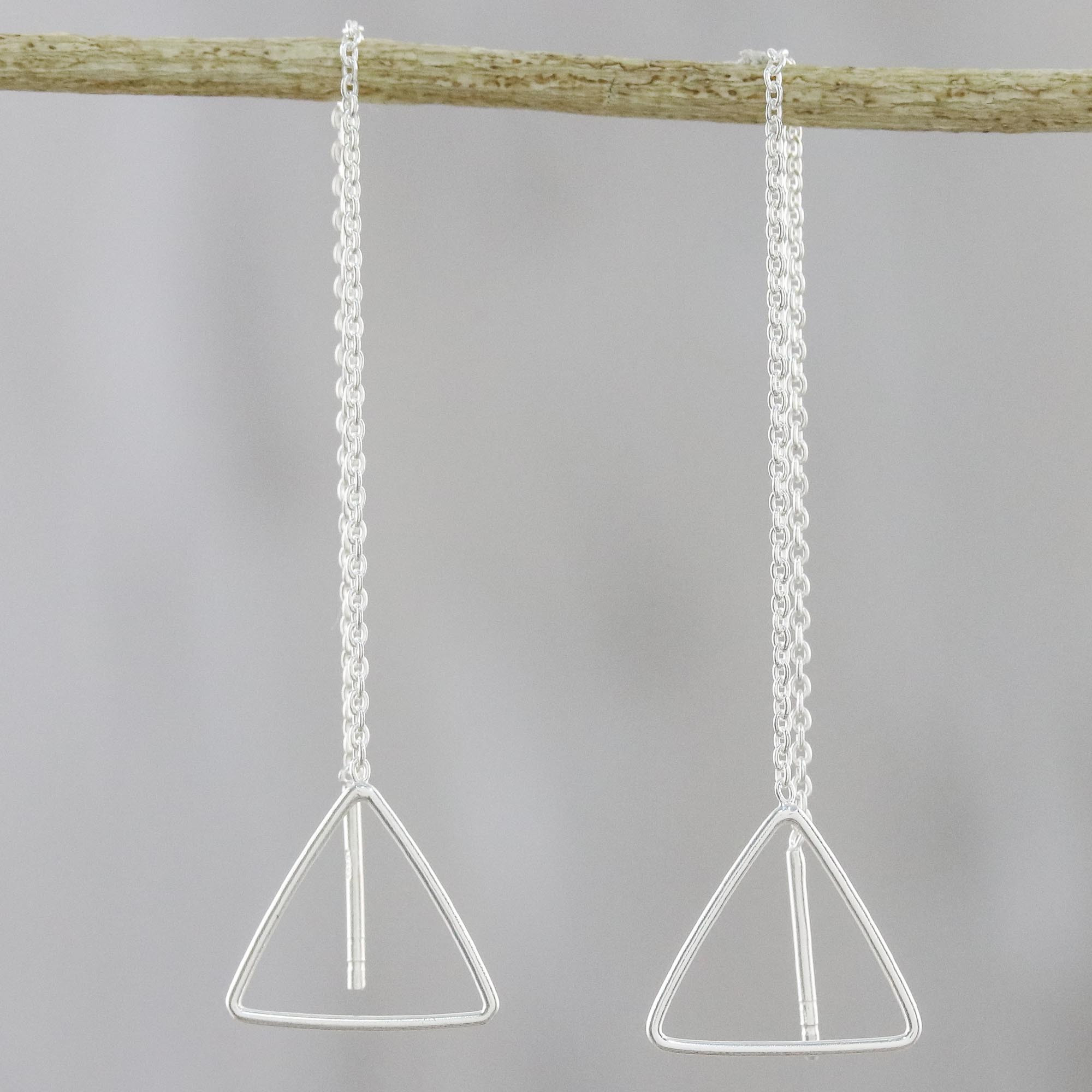 There's something about the simplicity in the shape of a triangle that is almost undefinable. This pair of minimalist, 925 sterling silver earrings is designed by Thai artisan Lalana. The minimal triangles are suspended by a high polish sterling silver chain and seem to almost hover in place, making the perfect complement to anything you pair them with.