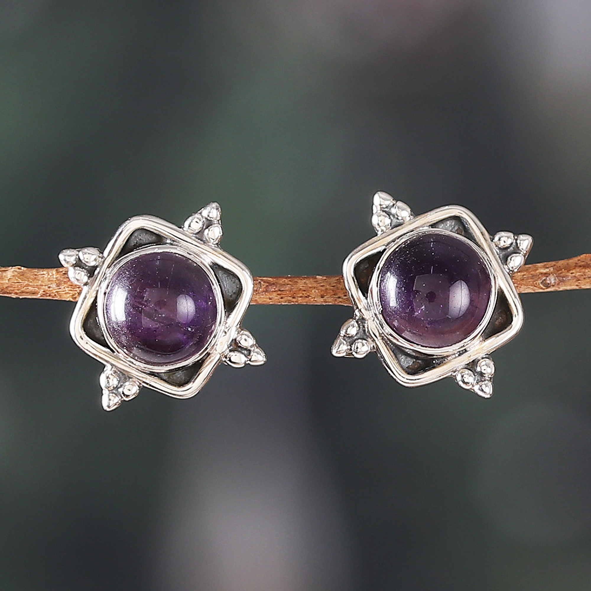 Artisan-Made Amethyst Cabochon Button Earrings from India, 'Sapience Marchioness'