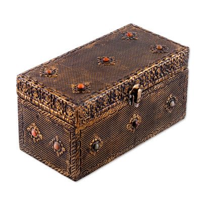 Artisan-Made Antiqued Brass and Glass Beaded Jewelry Box, 'Golden Fascination'