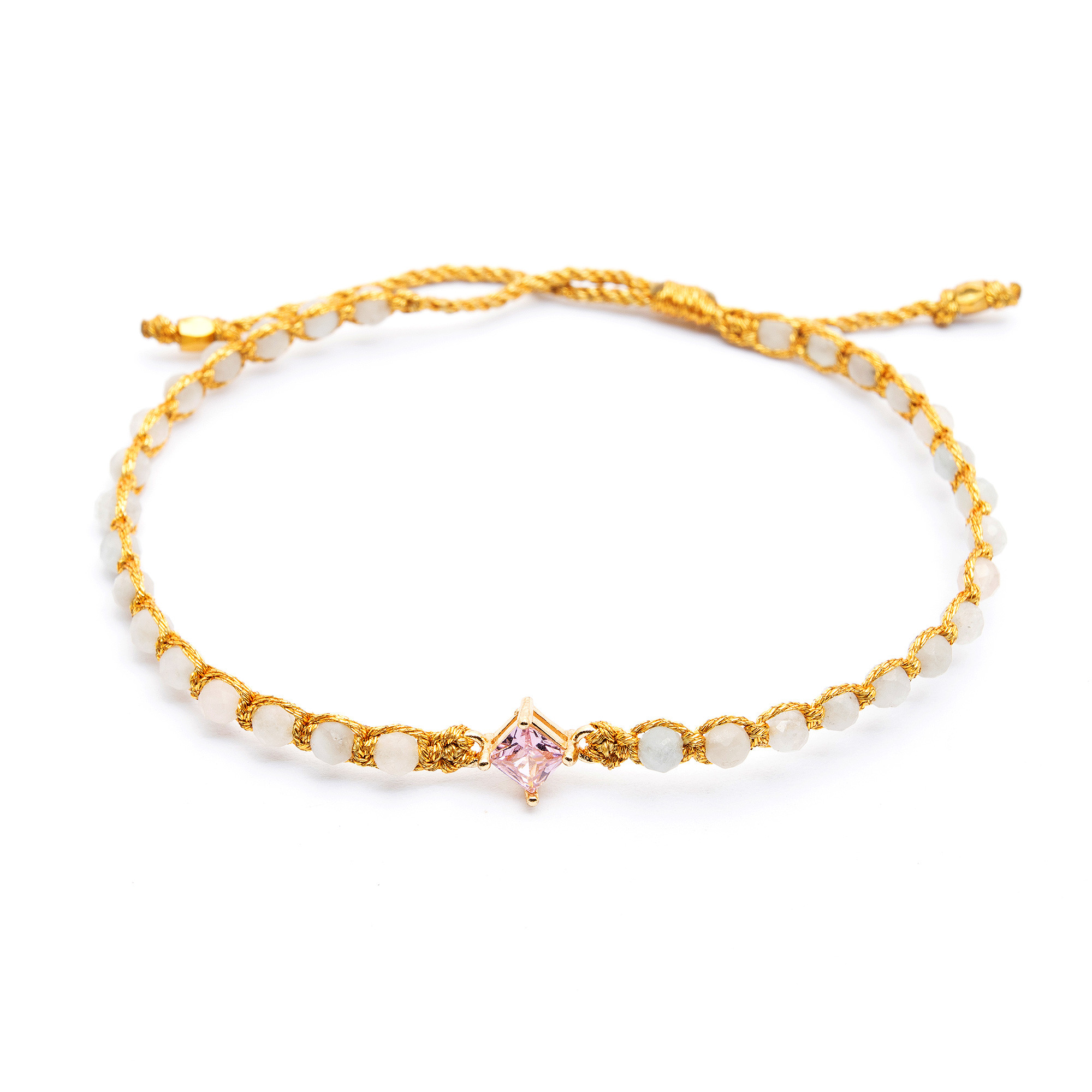Glowing with a mystic palette, this macrame pendant bracelet proves that sustainable fashion can be absolutely charming. A recycled glass pendant takes center stage, letting its pink hue be framed by 18k gold-plated accents. Aquamarine stones complete the accessory with ethereal sparkles that symbolize kindness, whereas an adjustable sliding knot closure allows Made Masna's design to be perfect for any occasion.