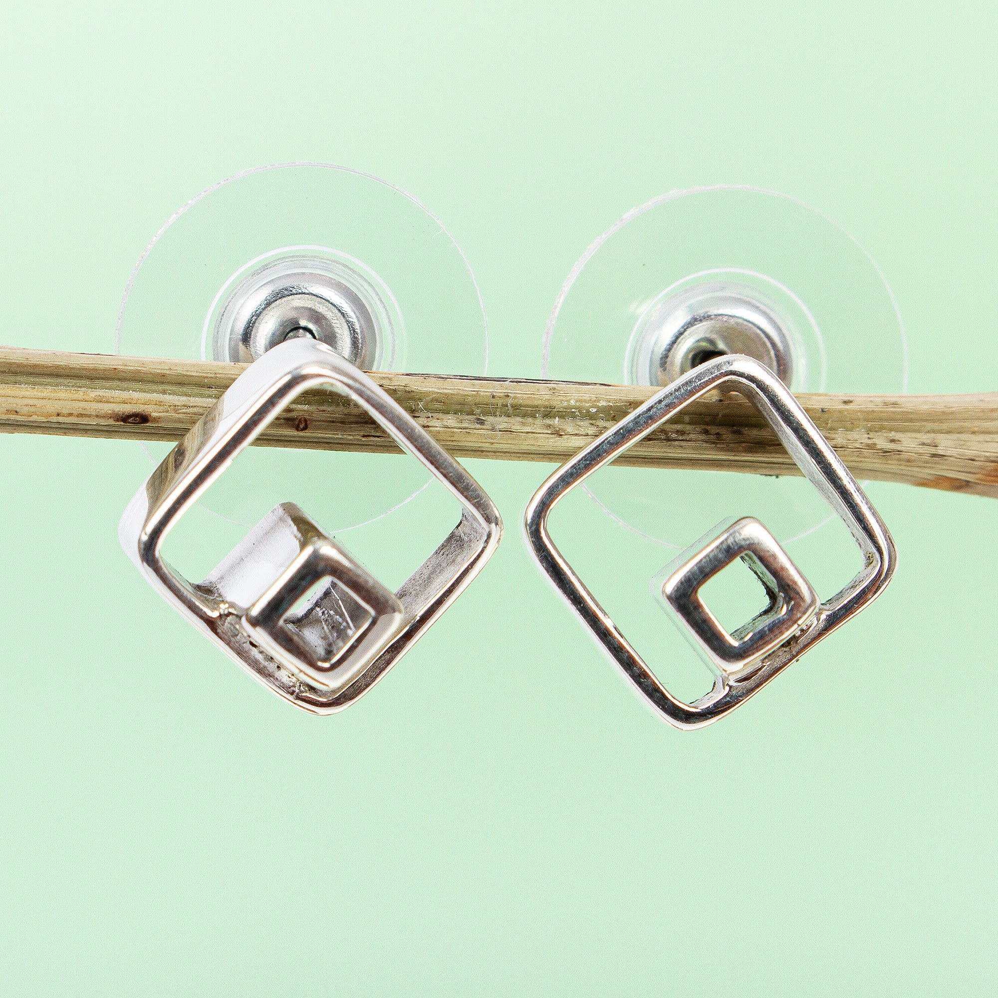 Petite open diamonds enclose a second diamond in contemporary stud earrings. Guillermo Arregui crafts this novel geometric design in sterling silver to wear everywhere and with everything.