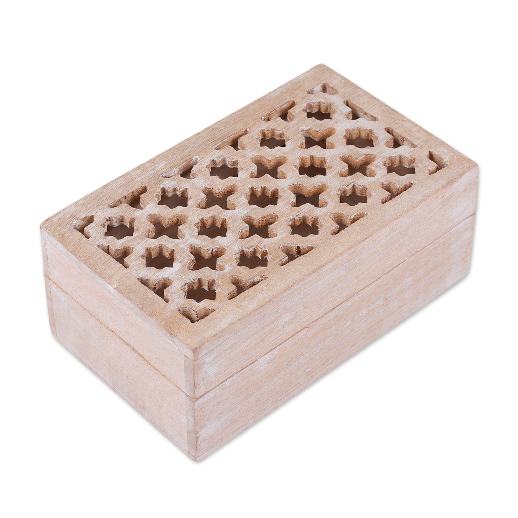 India's Mela Artisans invite you to keep your cherished treasures under the veil of trellis beauty. The team works with mango wood to craft this box, whose trellis-patterned lid makes it the perfect home accent. Made in a practical small size, the piece displays a bright natural hue.