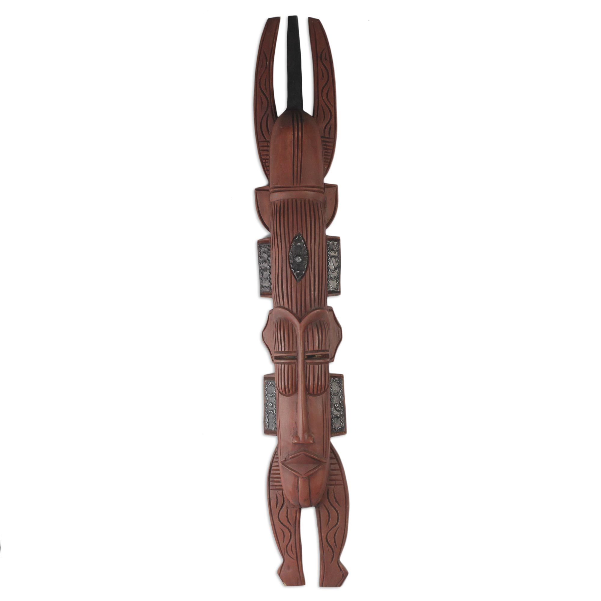 Displaying the visage of an Ashanti king, this mask beautifully symbolizes cultural strength. Embossed brass plates adorn the richness of hand-carved sese wood, while horns rise proudly above, evoking a kind of vertical symmetry. Robert Nortey exhibits his skill in every detail, patiently rendering regional motifs.