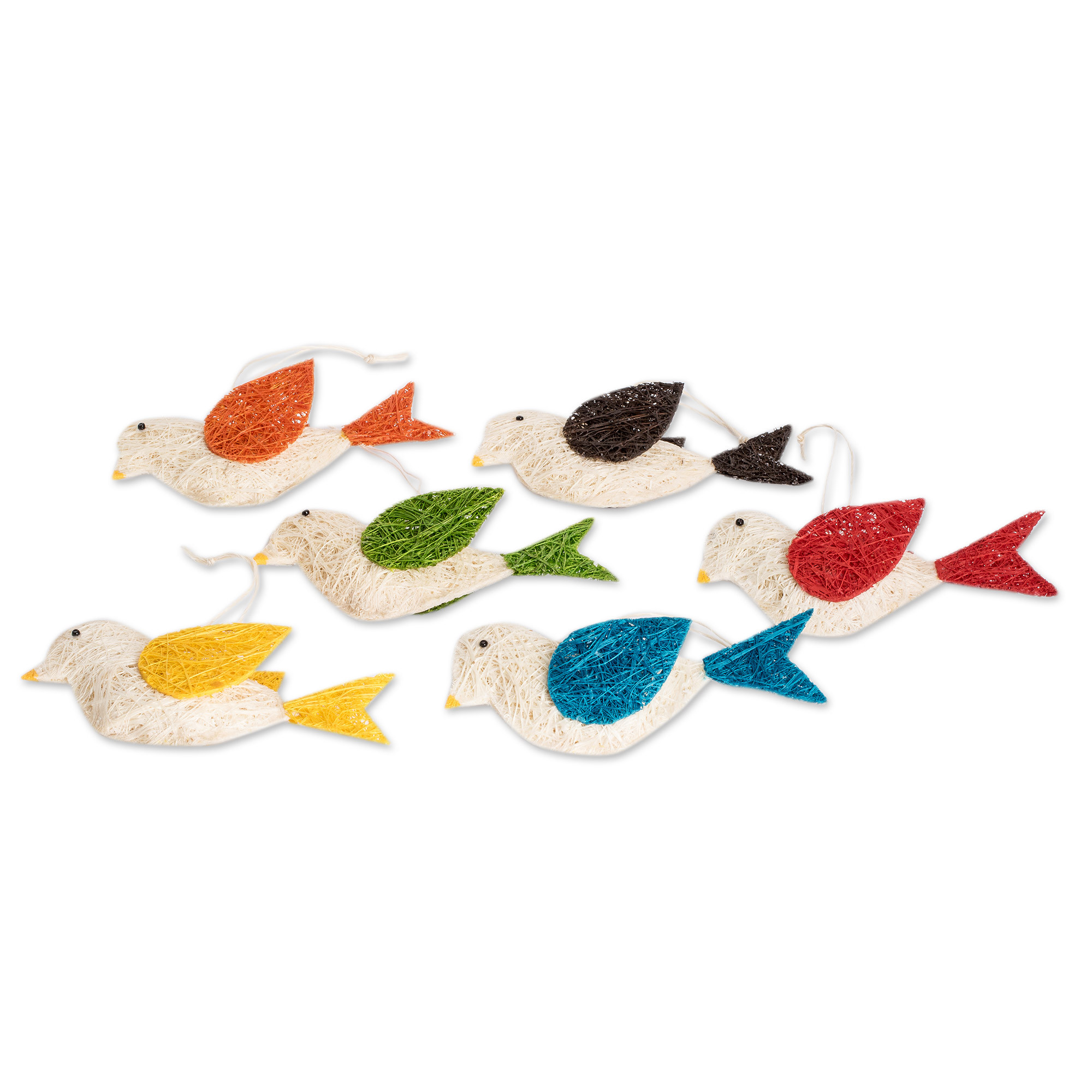 Crafted by hand of natural fique fiber and painted with wings and tails in blue, green, orange, brown, yellow, and red, this set of six dove ornaments will make a delightful addition to your tree this holiday season. Costa Rican artisan Blanca Padilla crafts this set. Glass beads form the doves' eyes.
