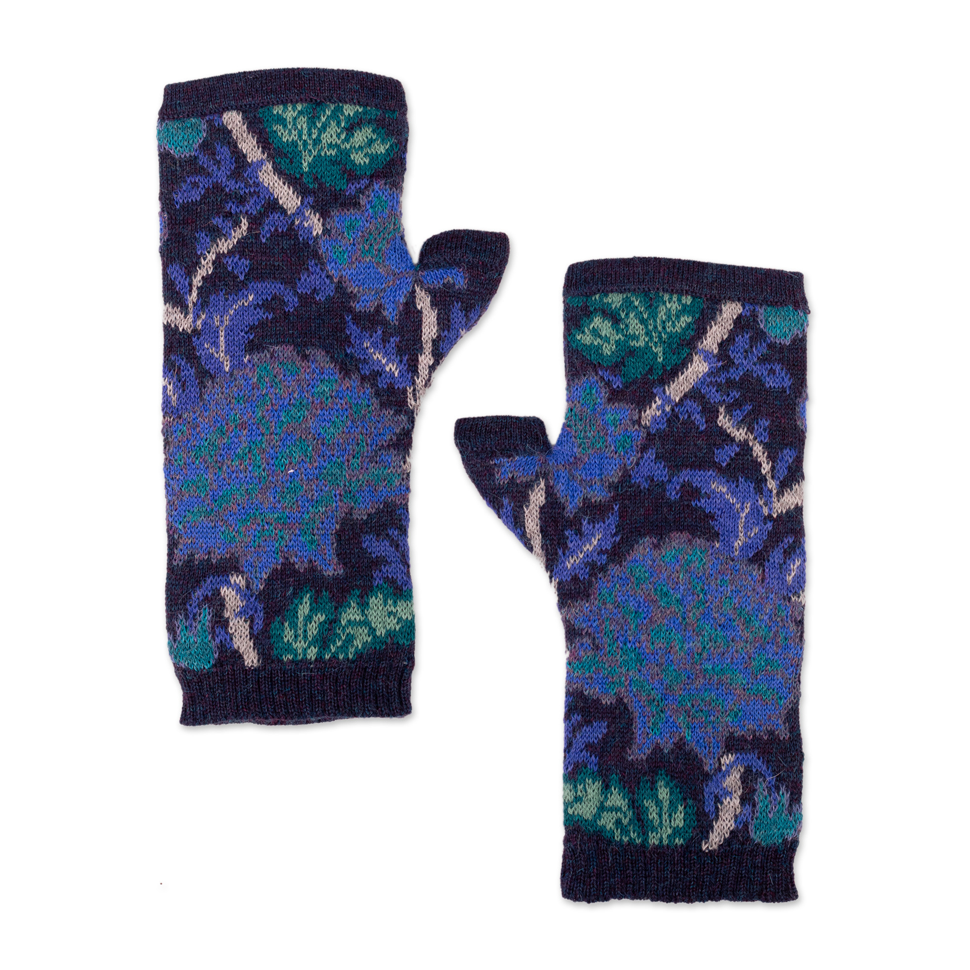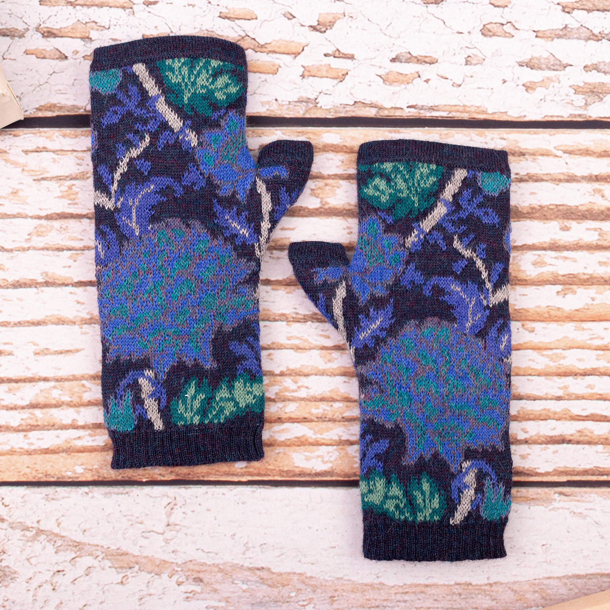 Baby Alpaca Floral and Leaf Knit Fingerless Mittens in Blue, 'Andean Blooms'