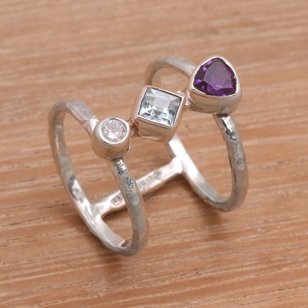 Sparkling amethyst and blue topaz meet a cubic zirconia, composing a stunning formation in this intriguing ring. Designed by Jenny Setiawan, this modern Balinese cocktail ring is crafted from sterling silver and features a double band with a hammered finish. The variegated shapes and faceted jewel tones create a stylish and contemporary statement.