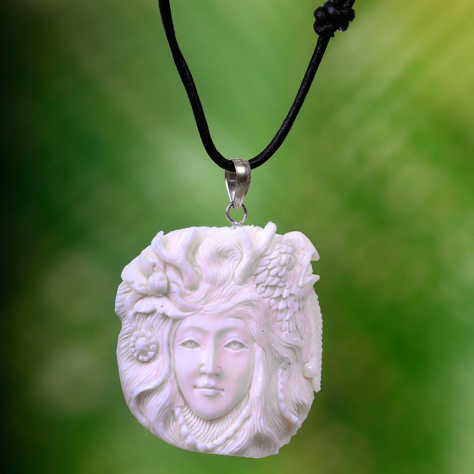 An eagle appears protectively with a mysterious woman of serene beauty. Bali's Made Wardika carves the intricate image of bone. The handcrafted pendant is worn on a necklace of very dark brown leather cords of adjustable length.