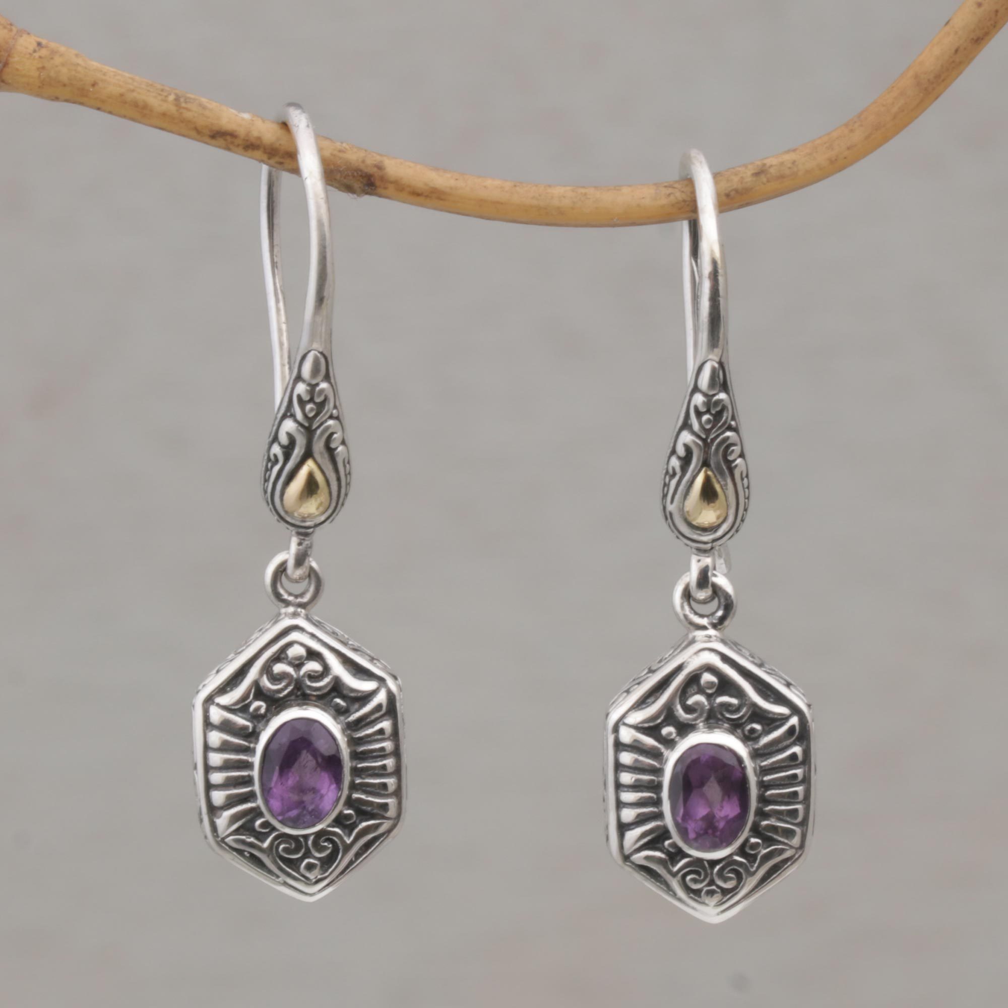 Balinese Amethyst and 925 Silver Earrings with Gold Accents, 'Beacon Fire'