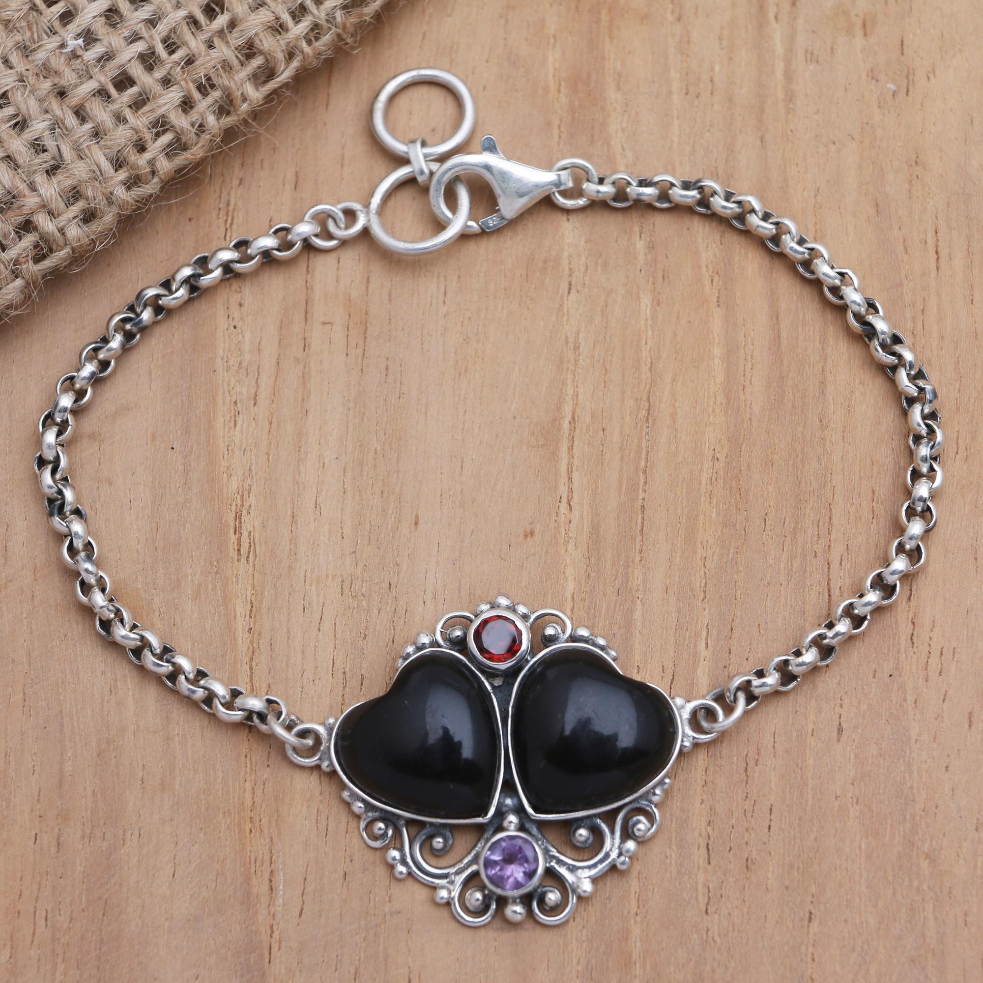 Perfect for a double date, Ayu Ary's charming pendant bracelet features two glossy hearts and two twinkling gemstone. The Balinese artisan centers the bracelet with a hand carved horn pendant she embellishes with petite garnet and amethyst stones. A chunky, sterling silver rolo chain with a lobster claw clasp finishes the bracelet with shine.