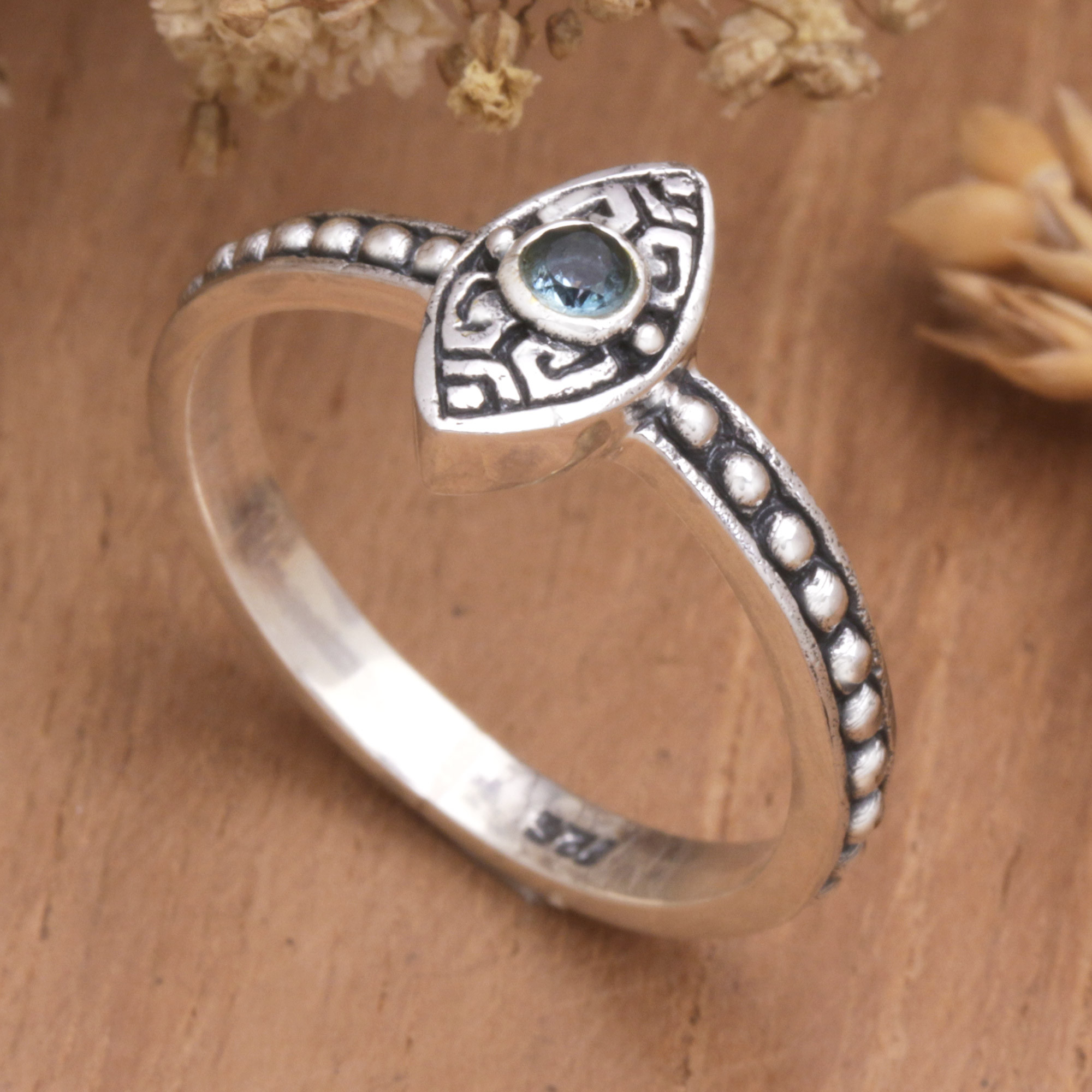 Intricate motifs surrounding a gleaming blue topaz gemstone and delicate dots on the band are special details that help make this cocktail ring something unique. The gorgeous ring is designed by Dewa Arimbawa and crafted from sterling silver in the shape of a marquise diamond.