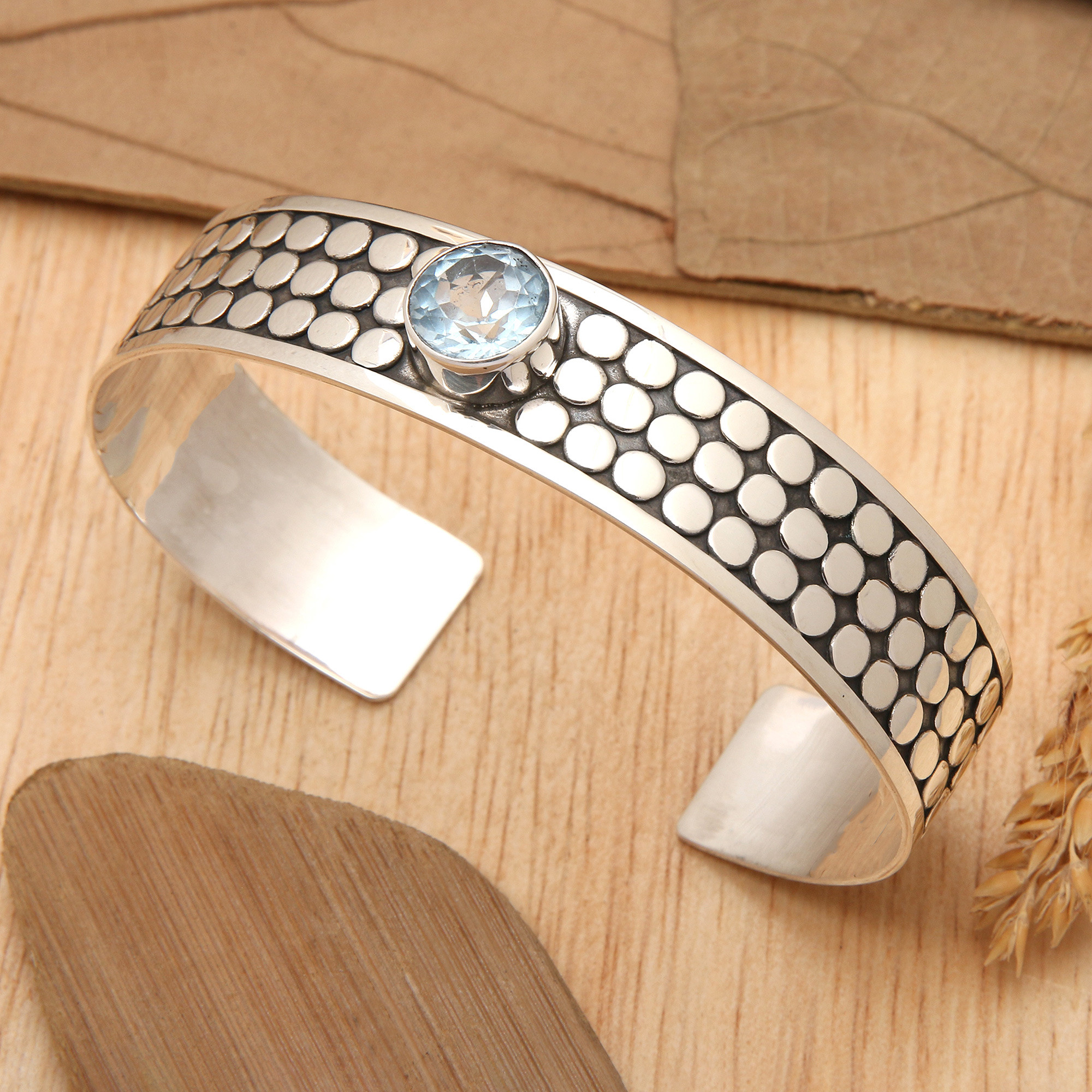 A shimmering 5.5 carat blue topaz gemstone emerges from a sea of shining circle motifs in this elegant cuff bracelet. Indonesian artisan Suar Dwipayana hand crafts this sterling silver cuff, creating an accessory that embraces the wrist with modern charm.