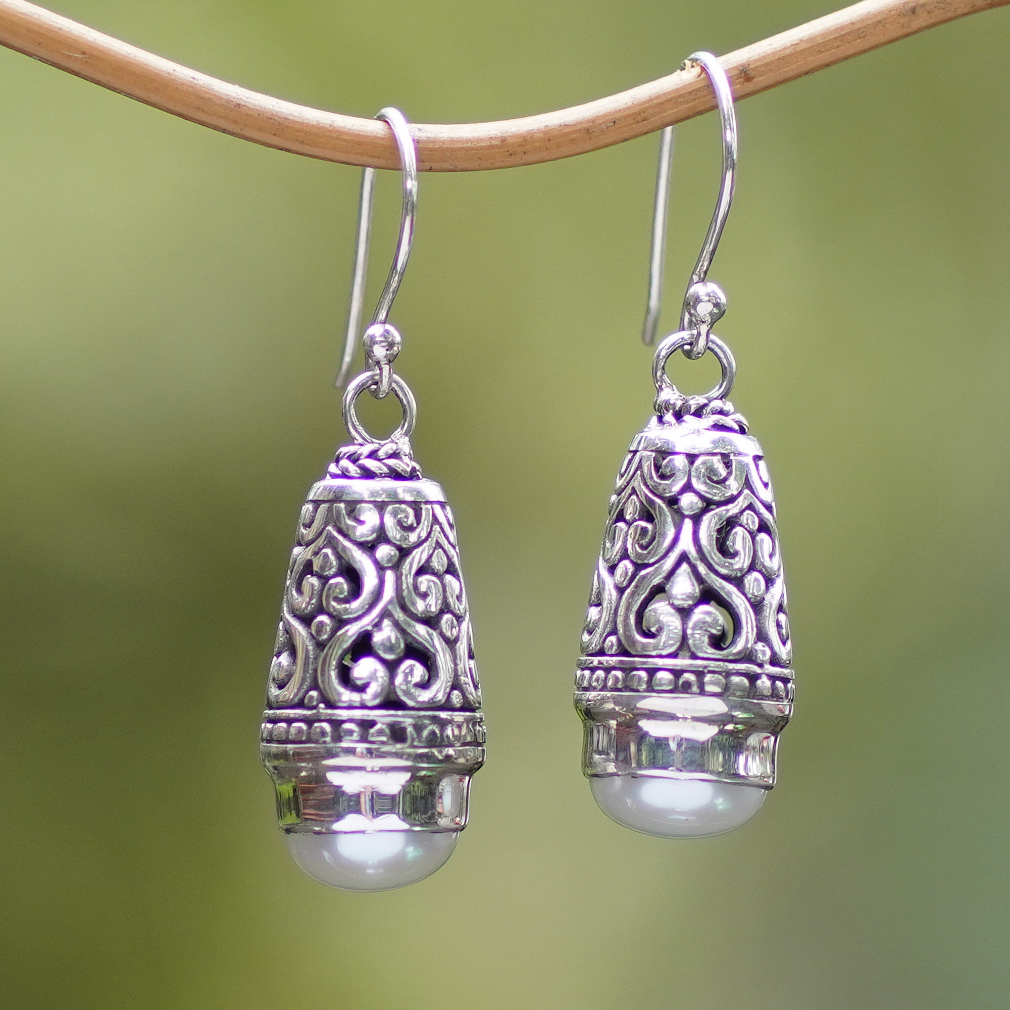 Wonderfully ornate, these handcrafted earrings evoke petite temple bells. Bali's Yus Swarmana complements finely-worked sterling silver with luminous cultured pearls.