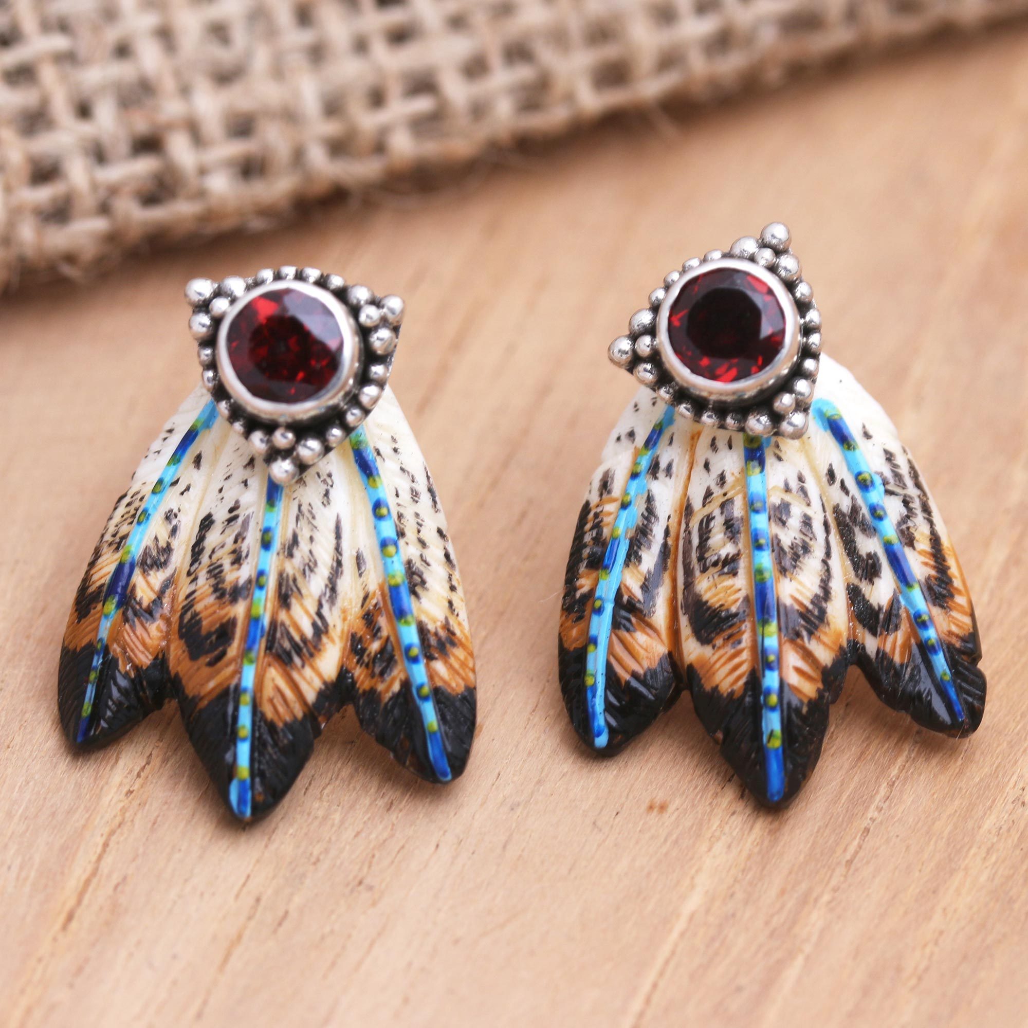 Sure to attract admirers, Ayu Ary's beautiful earrings are designed to resemble feathers. The Balinese artisan hand carves the earrings from pale bone before painting the surface black, brown, and blue in a convincing feather motif. A faceted garnet gemstone in a bezel setting shines at the top of the pretty pair.